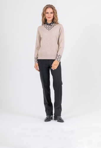 На сайте указаны российские размеры. Ткань: выполнен из качественного гладкого трикотажа. В составе 6% шерсть,10% нейлон, 59% полиэстер, 10% вискоза. Крой: слегка приталенный джемпер из гладкого трикотажа средней плотности. Женственная, подчеркивающая все достоинства фигуры модель создает гармоничный и спокойный образ, который захотят повторить. Оригинальный ворот выделяется своей необычной конструкцией и подчеркивает красоту шеи. Длинные, чуть свободные рукава с манжетом-резинкой, не сковывают движения, дарят комфорт и тело. Джемпер представлен в двух стильных цветах – черном и бежевом. Отделка: двусторонний ворот, сложенный изящным уголком, поражает воображение: контраст двух цветов, усиленный узором «круги», делает образ запоминающимся и на 100% стильным. Цветовое решение поддерживают и рукава с тем же принтом. Сочетайте с однотонными вещами из коллекции Stern, чтобы не смещать фокус внимания с красивой отделки джемпера. Рост модели: 174 см Длина по спинке: 60 см