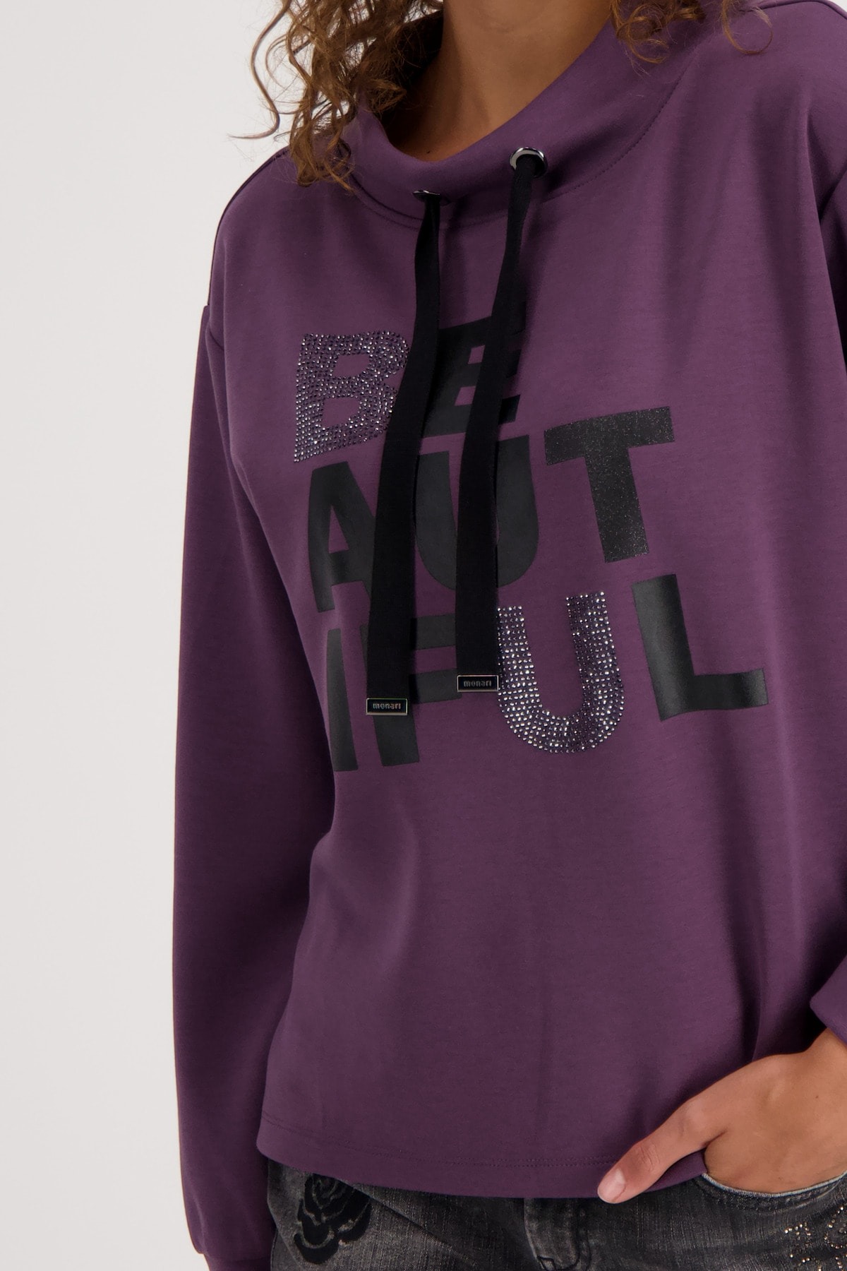 На сайте указаны российские размеры. Толстовка с длинными рукавами, воротником-стойкой и стразами. Удобная посадка обещается благодаря прямому крою с воротником-стойкой, широким манжетам на концах рукавов и слегка завышенным плечам. Надпись из глиттера, сверкающих стразов и блестящего лакового принта стала изюминкой довольно простой во всем остальном рубашки. Модель ростом 176 см