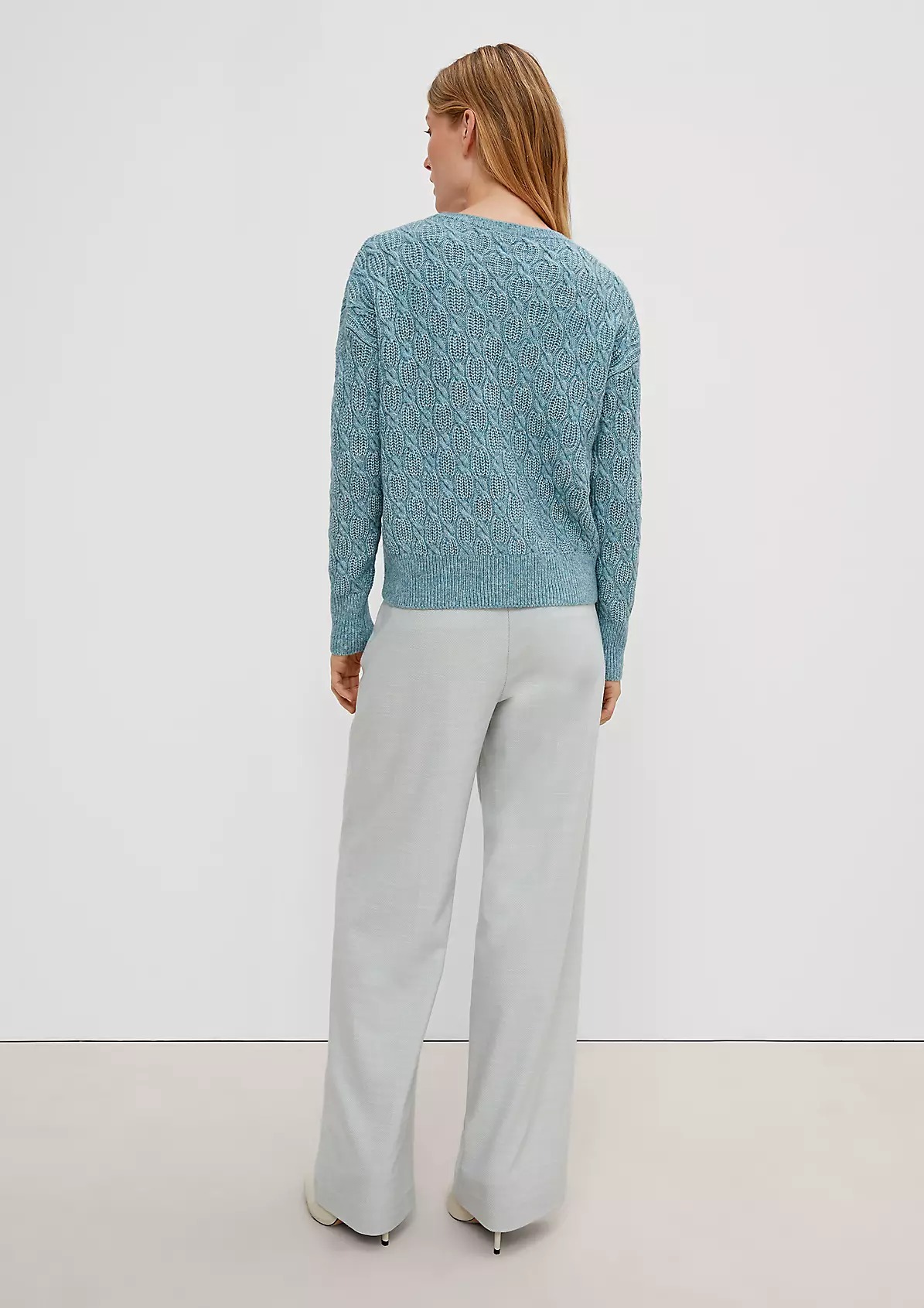 На сайте указаны российские размеры. Вязаный джемпер с круглым вырезом. Манжеты в рубчик, заниженная линия плеча. Детали: ребристые края, ребристая отделка. Длина спинки в 44 размере - 54 см.