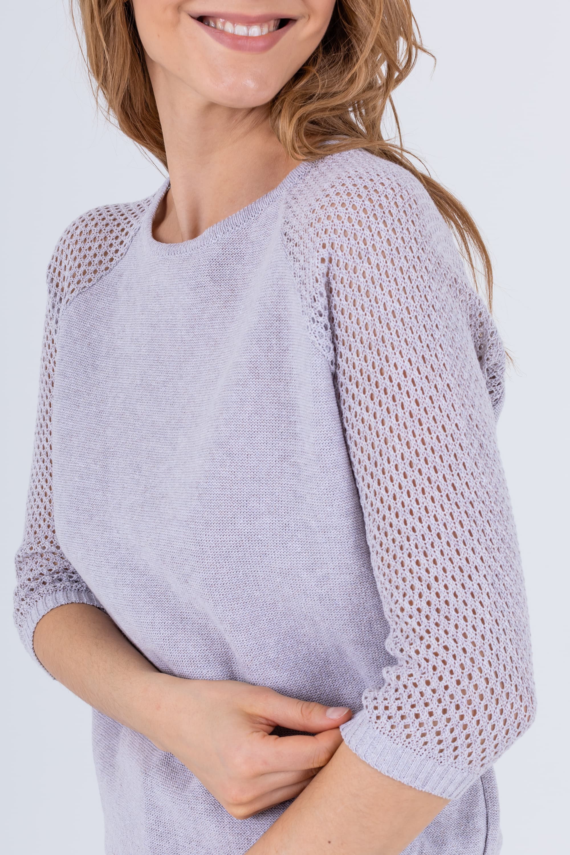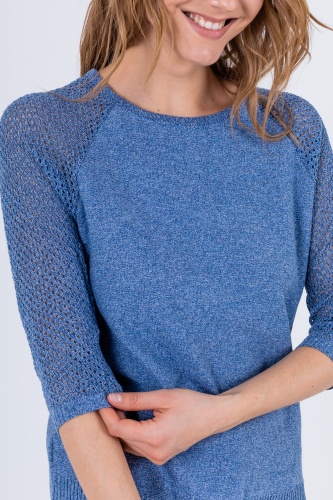 На сайте указаны российские размеры. Джемпер средней длины прямого силуэта из легкого хлопка с добавлением полиакрилонитрила, дизайнерская особенность модели – ажурный трикотаж на рукавах. Перед и спинка по низу обработаны манжетой. Рукава реглан ¾ с манжетами. Круглый вырез горловины.