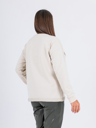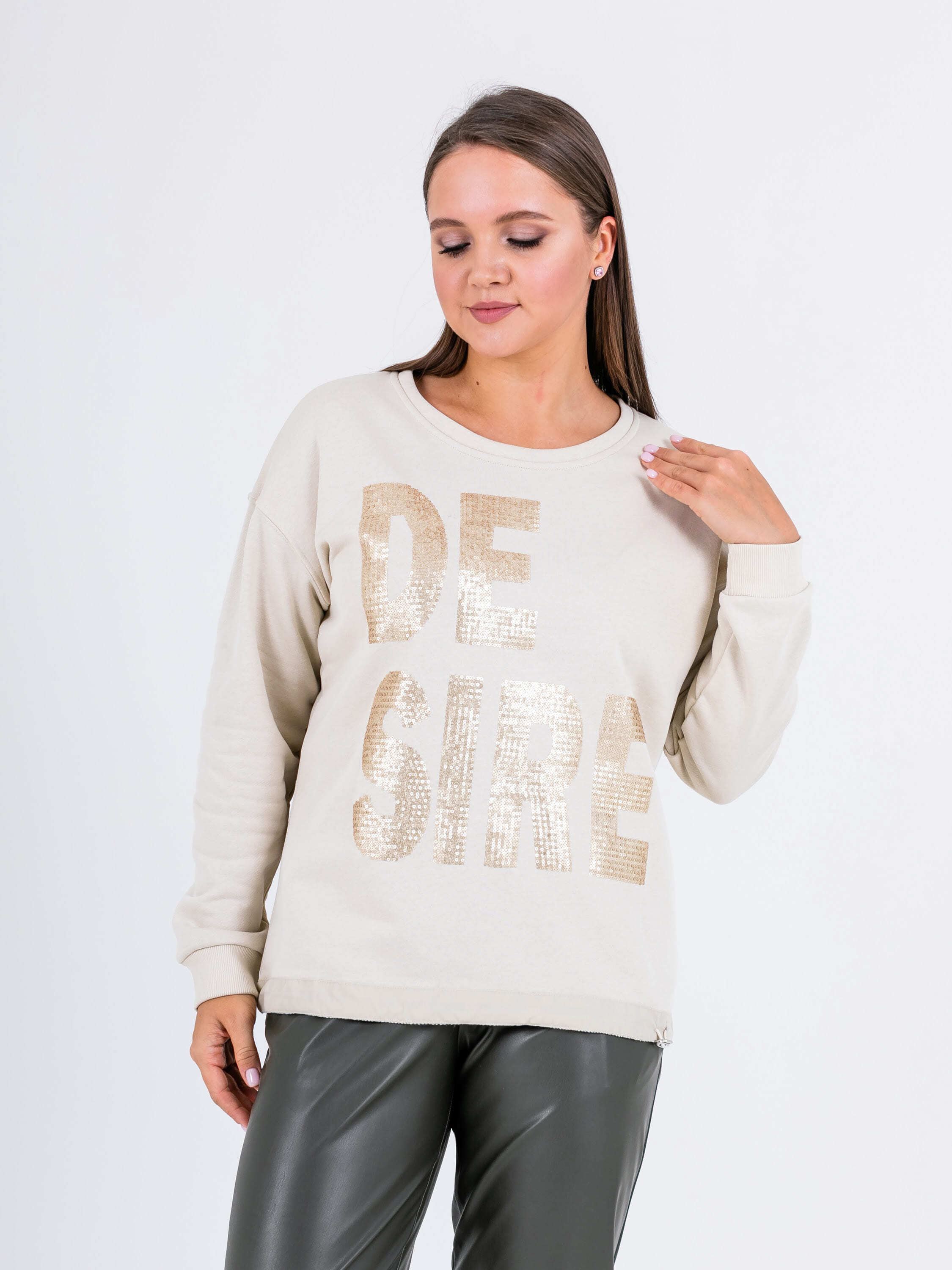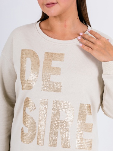 Свитшот прямого силуэта средней длины из легкого 100% хлопка. По переду выполнена эффектная вышивка пайетками. Низ обработан кулиской с резинкой и металлическим фиксатором, для регулировки объема. Длинные втачные рукава с манжетами. Круглый вырез горловины.