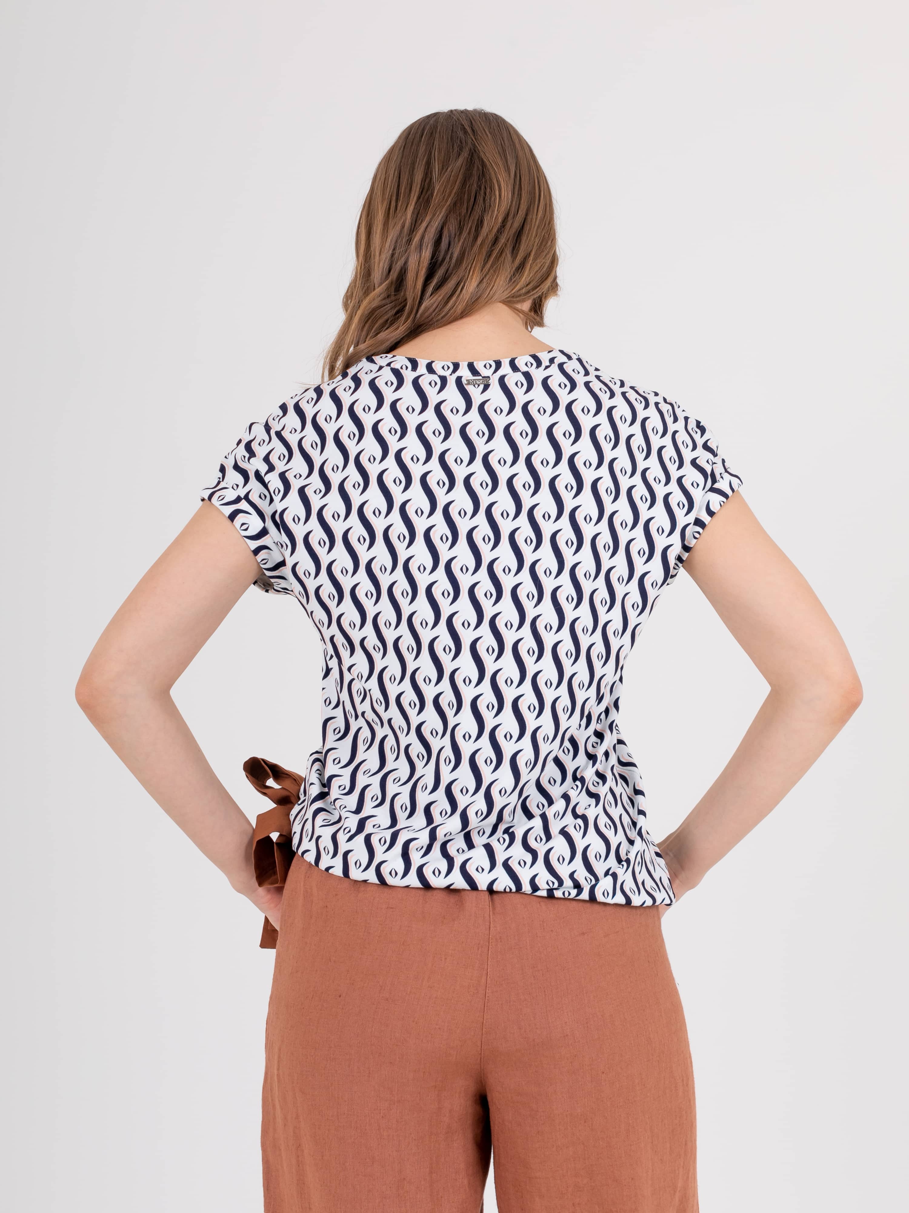 Футболка средней длины прямого силуэта из легкой, мягкой вискозы с добавлением эластана, дизайнерская особенность модели – яркий принт. Короткие цельнокроеные рукава с манжетами. Круглый вырез горловины с разрезом, обработан косой бейкой, которая переходит в декоративную планку по переду.