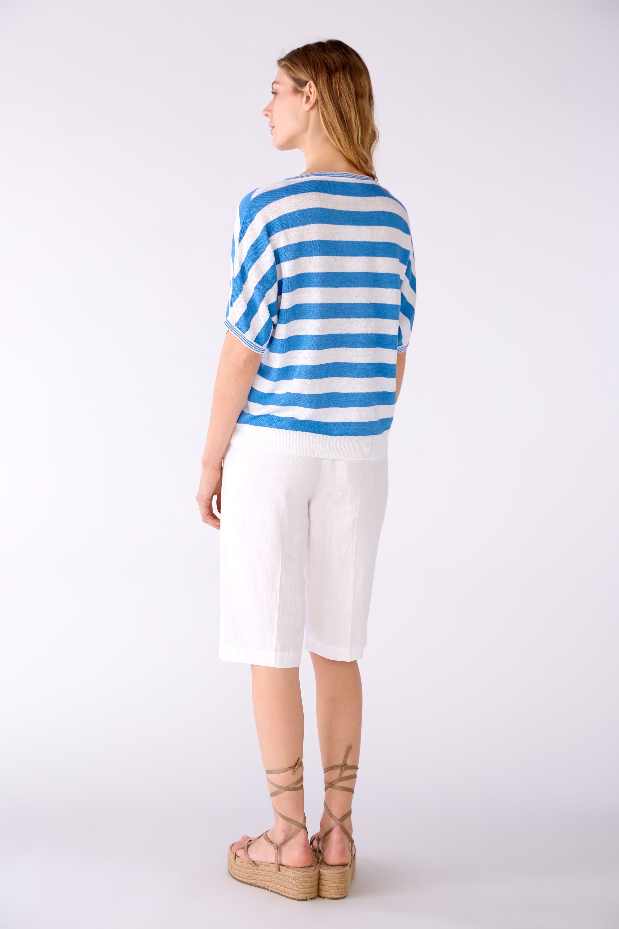 Джемпер в широкую полоску из 100% натурального льна. Свободный крой, стандартная длина. Мини-нашивки на воротнике и манжетах. Спущенные плечи, женственный круглый вырез. Ребристый подол. Длина в размере 42: 60 см.