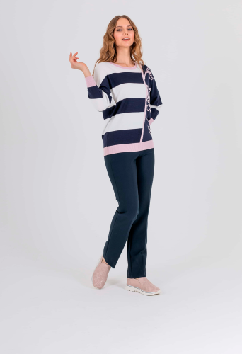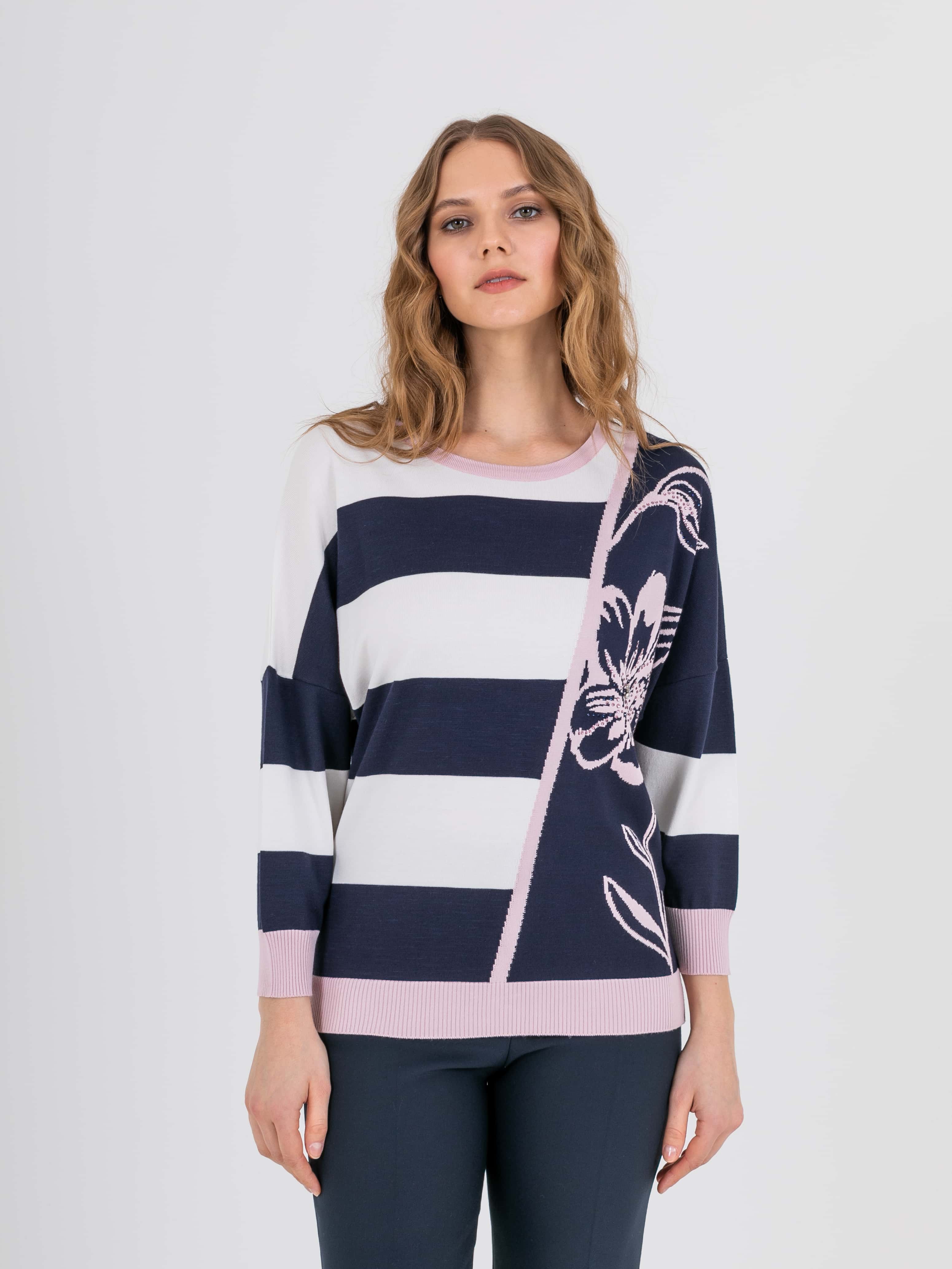 Джемпер средней длины прямого силуэта из мягкой вискозы с добавлением эластана, дизайнерская особенность модели – геометрический рисунок. Перед и спинка по низу обработаны манжетой. По переду выполнен нежный цветочный рисунок со стразами. Длинные втачные рукава со спущенной линией плеча и манжетами. Круглый вырез горловины.
