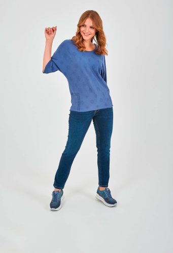 Джемпер средней длины прямого силуэта из мягкой вискозы с добавлением эластана, дизайнерская особенность модели – ажурный трикотаж с имитацией карманов и стразами. Цельнокроеные рукава до локтя. Круглый вырез горловины.