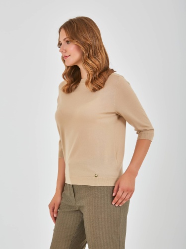 Джемпер средней длины прямого силуэта из мягкой шерсти с добавлением нейлона и люрекса. Перед и спинка по низу обработаны манжетой. Втачные рукава 3/4 с манжетами. Круглый вырез горловины.