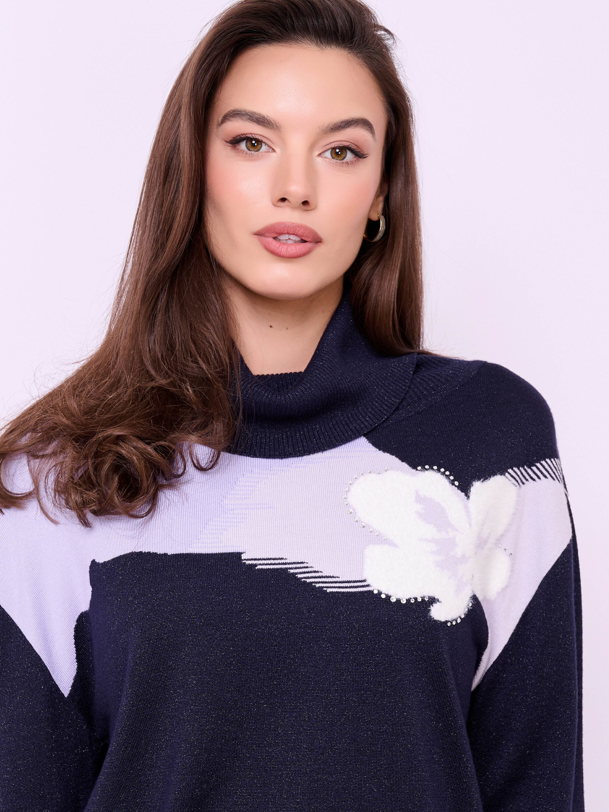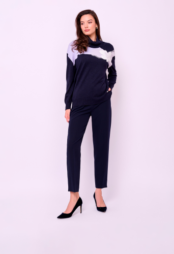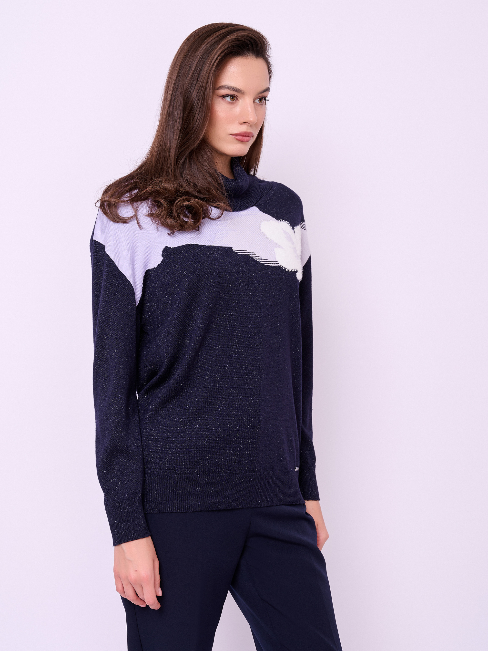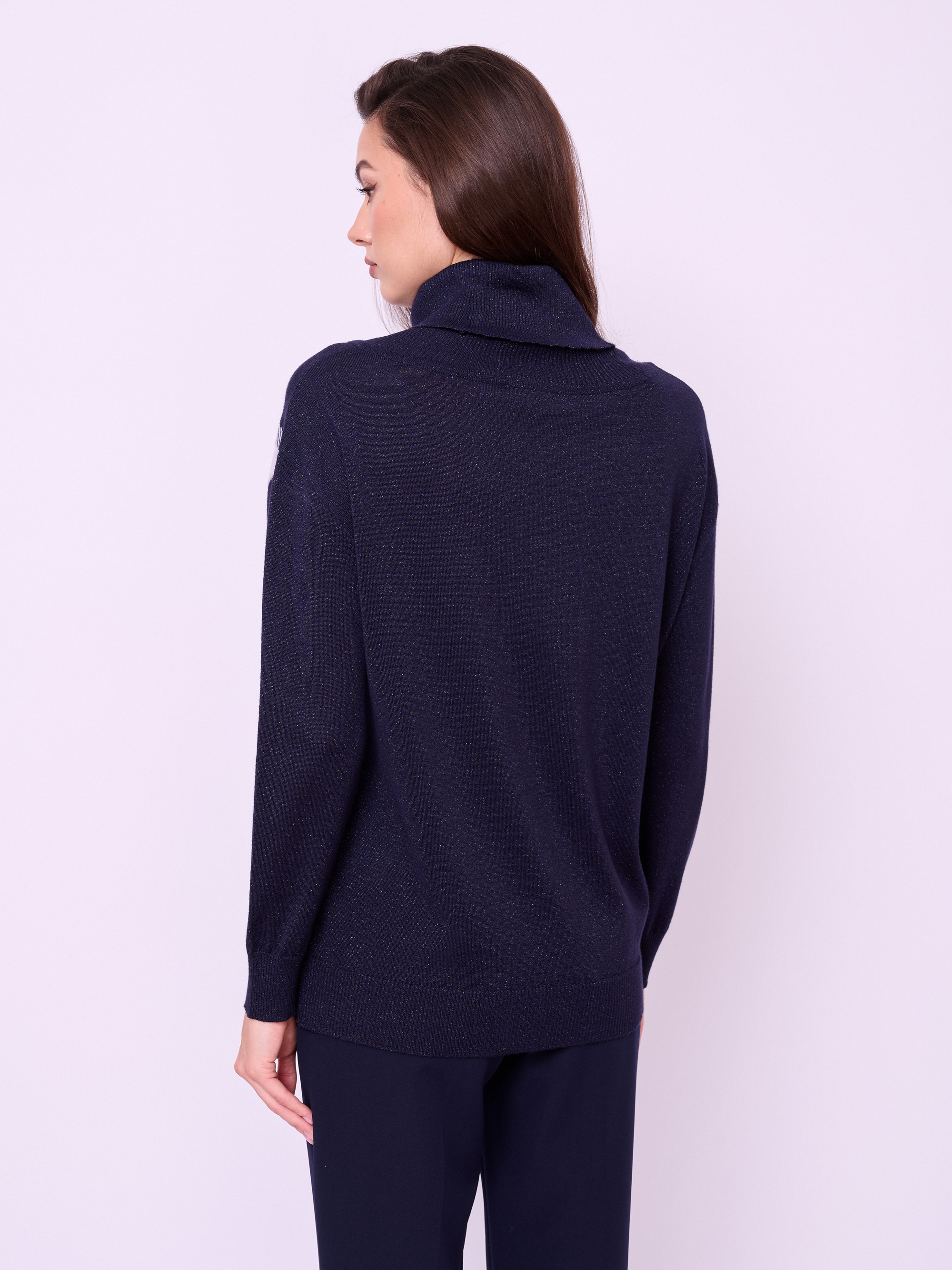 Трикотажная джемпер из смесовой вискозной пряжи с добавлением люрекса, с длинными рукавами, воротником-хомутом и стразами на груди. Длина по спинке: 62 см.