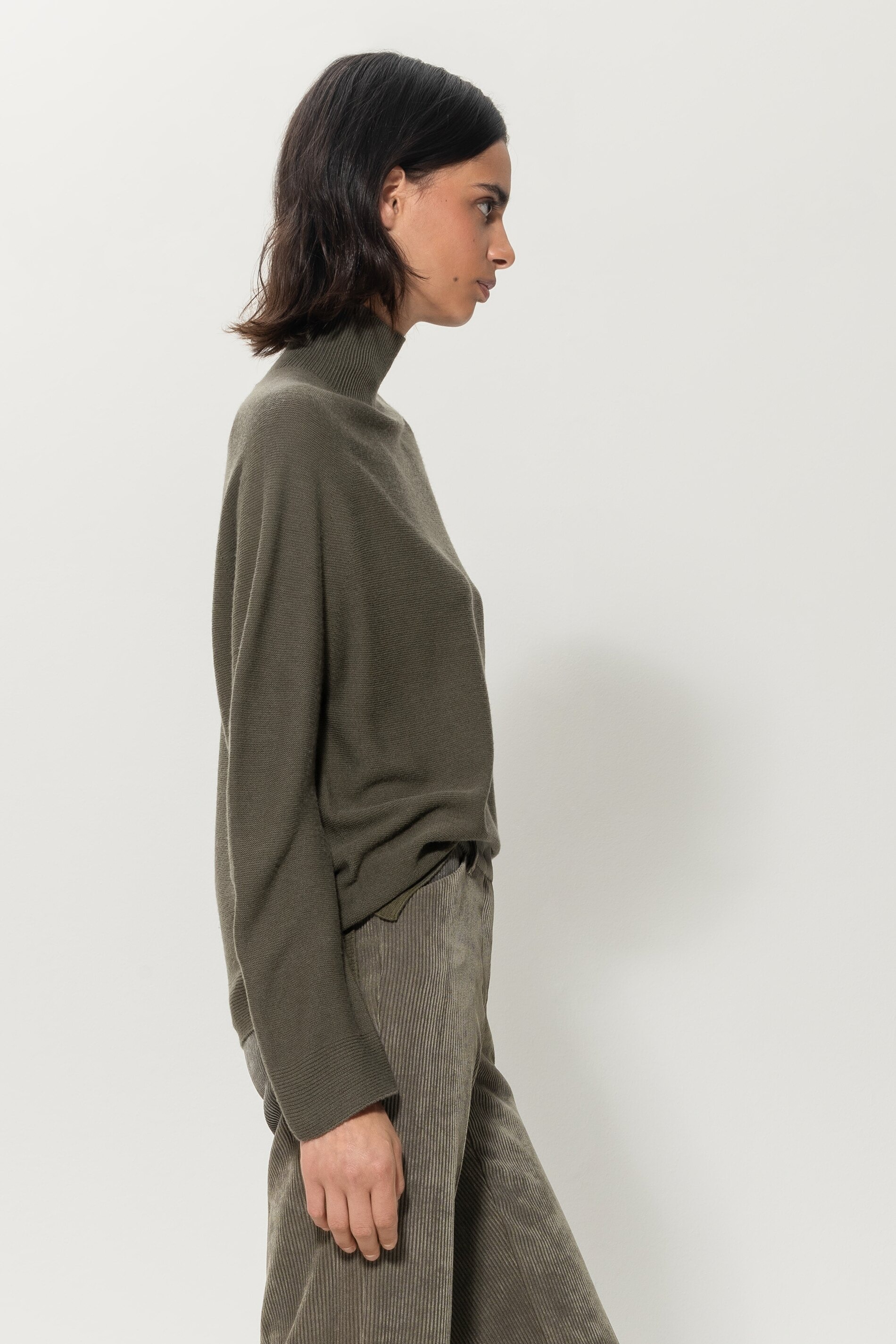 Повседневный пуловер из легкой смесовой шерсти тонкой вязки. Ложный воротник-стойка, рукава реглан и разрезы по бокам завершают этот современный дизайн.