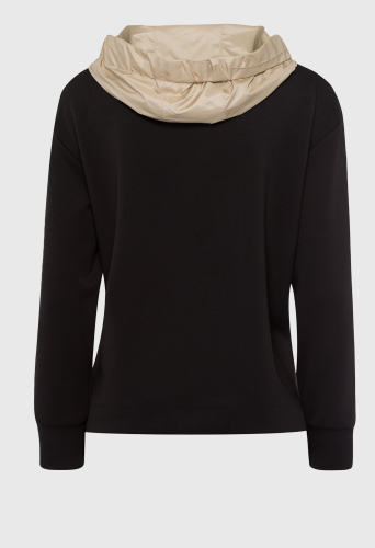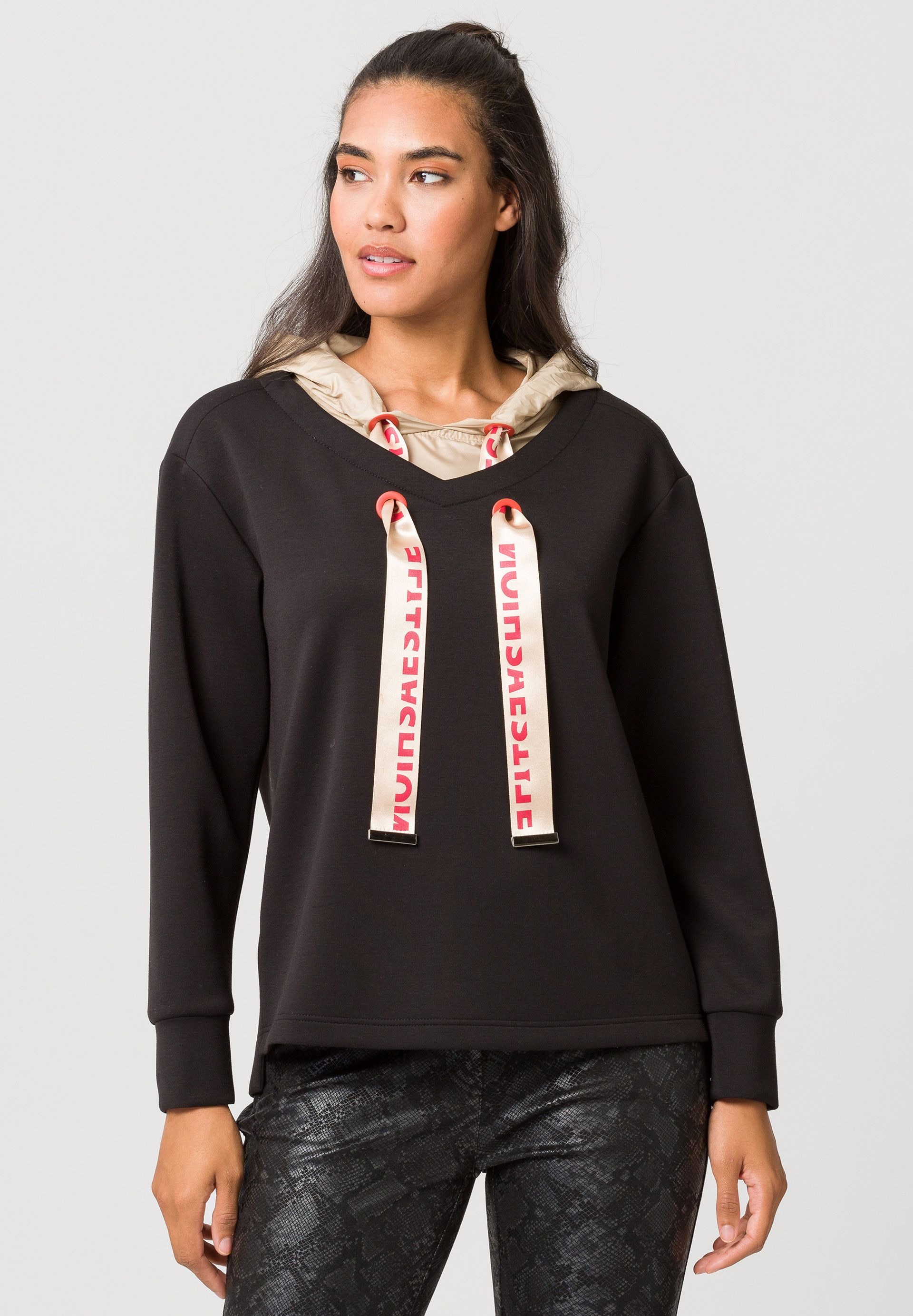 Женский пуловер с капюшоном и эффектной кулиской. Это отличная основа для ярких городских образов. Простой свитер из очень мягкого трикотажа имеет минималистичный дизайн, дополненный стильным капюшоном. Он выделяется, с одной стороны, матовой блестящей тканью, но, прежде всего, заметно широкими и классными бретелями на шнурке с принтом. Они продеваются через две пары петель соответствующего цвета. Эксклюзивный дизайн, непревзойденный комфорт в ношении – этот свитер просто незаменим!