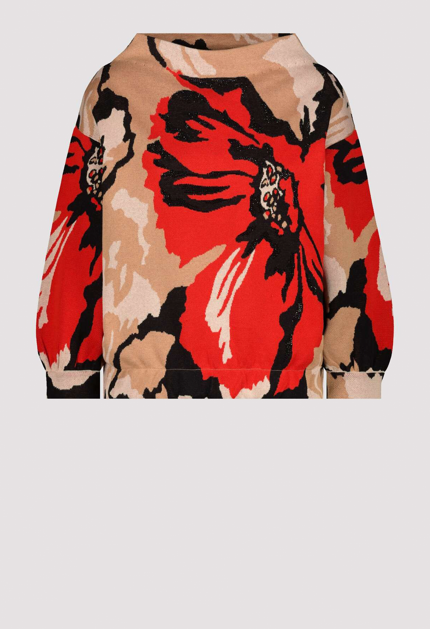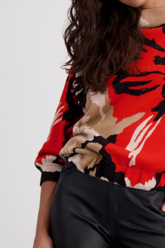 Удобный хлопковый свитер впечатляет красивой жаккардовой тканью с цветочным узором. Цветочный узор украшен сверкающими стразами. Регулярная посадка, воротник-стойка. Манжеты с рюшами. Длина 44 размера 56 см.
