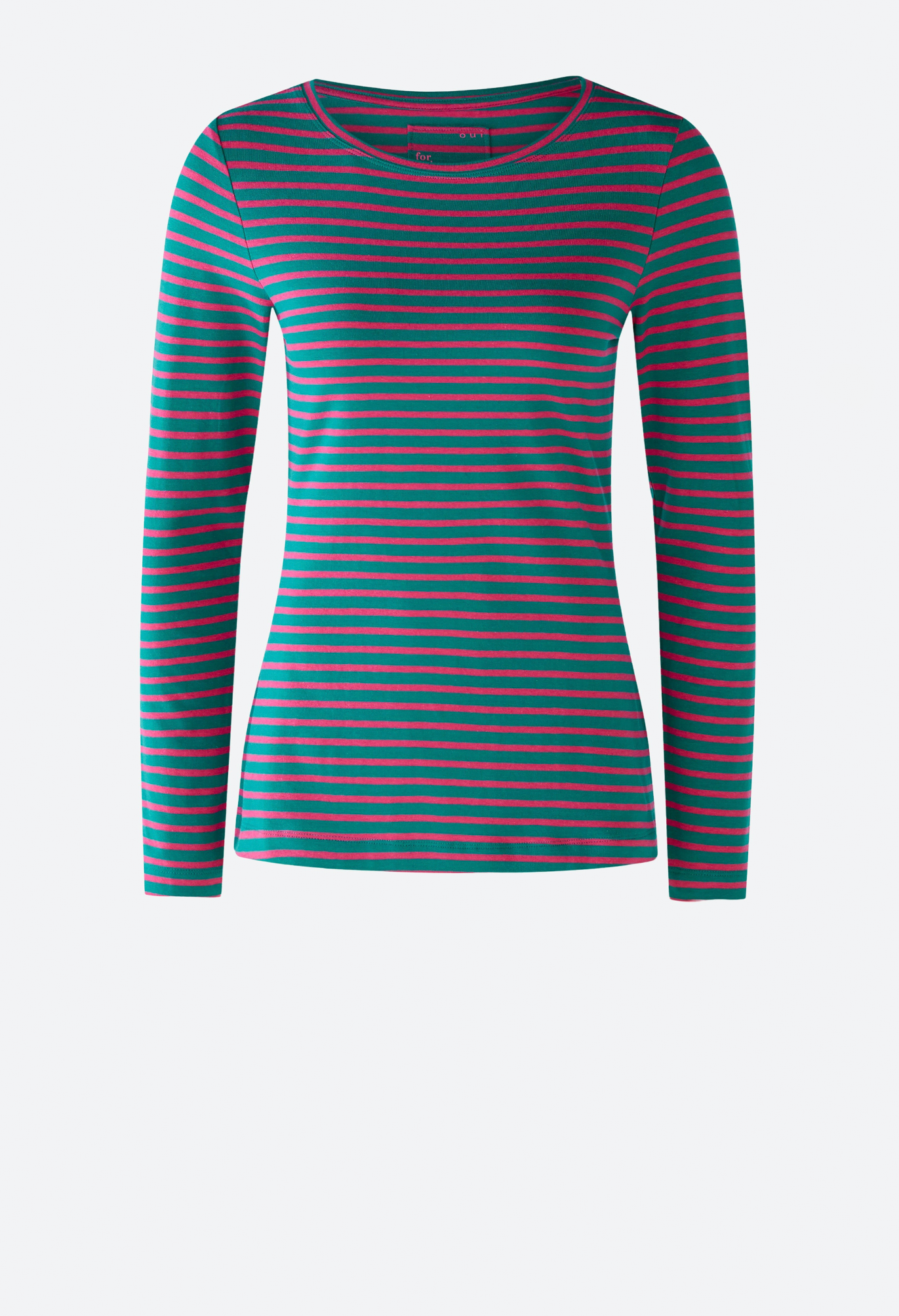 Базовая рубашка из комфортного хлопкового модала с трикотажными полосками. Слегка приталенный крой, стандартная длина. Шея круглая с красивой отделкой. Длинная рука. Разрезы по боковым швам. Длина для размера 42 - 64 см.