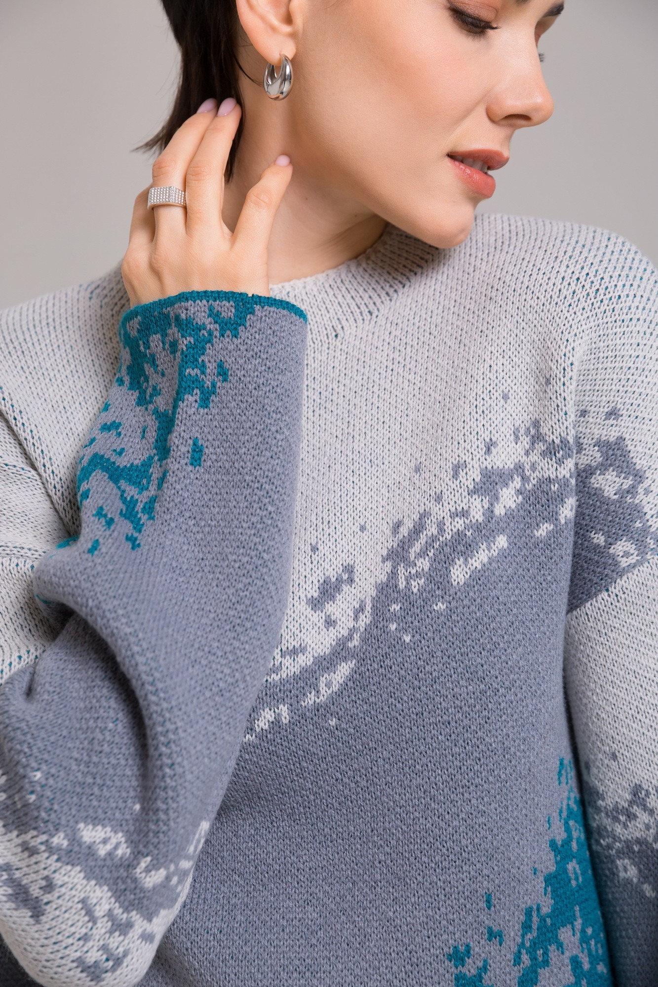 Оригинальный пуловер в технике неполного жаккарда выполнен из сияющего сочетания глубоких зеленых и серых оттенков.