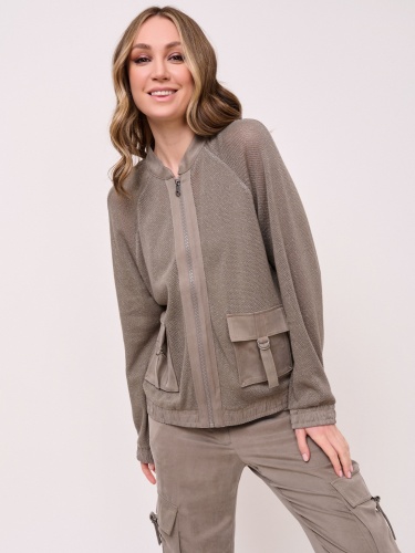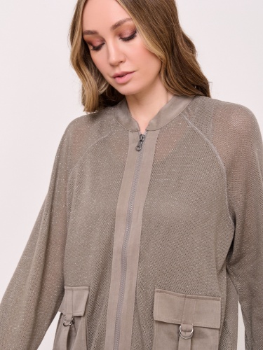 Детали: ажурный трикотаж, застежка молния, вырез горловины воротник-стойка, рукава-реглан длинные, карманы накладные, манжеты на резинке. Длина по спинке: 58 см.