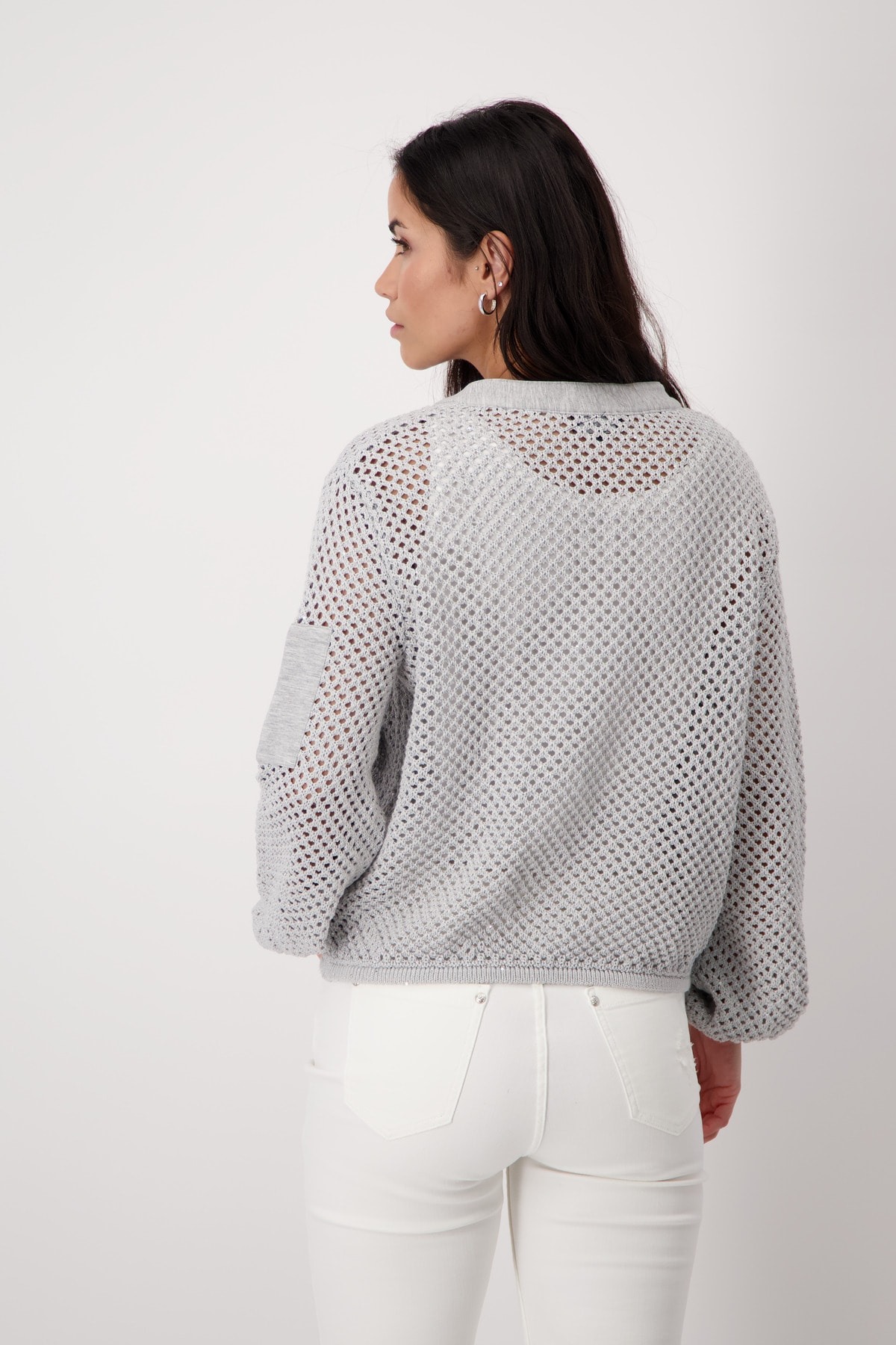 Современный кардиган из высококачественной смеси хлопка с блестящей люрексовой пряжей и ажурным узором. Регулярная посадка. Круглый вырез горловины с кнопкой. Длинный рукав. Ребристые манжеты и подол. Карман на молнии на левой руке. Ложный нагрудный карман на молнии. Двусторонняя молния. Длина 44 размера 52 см.
