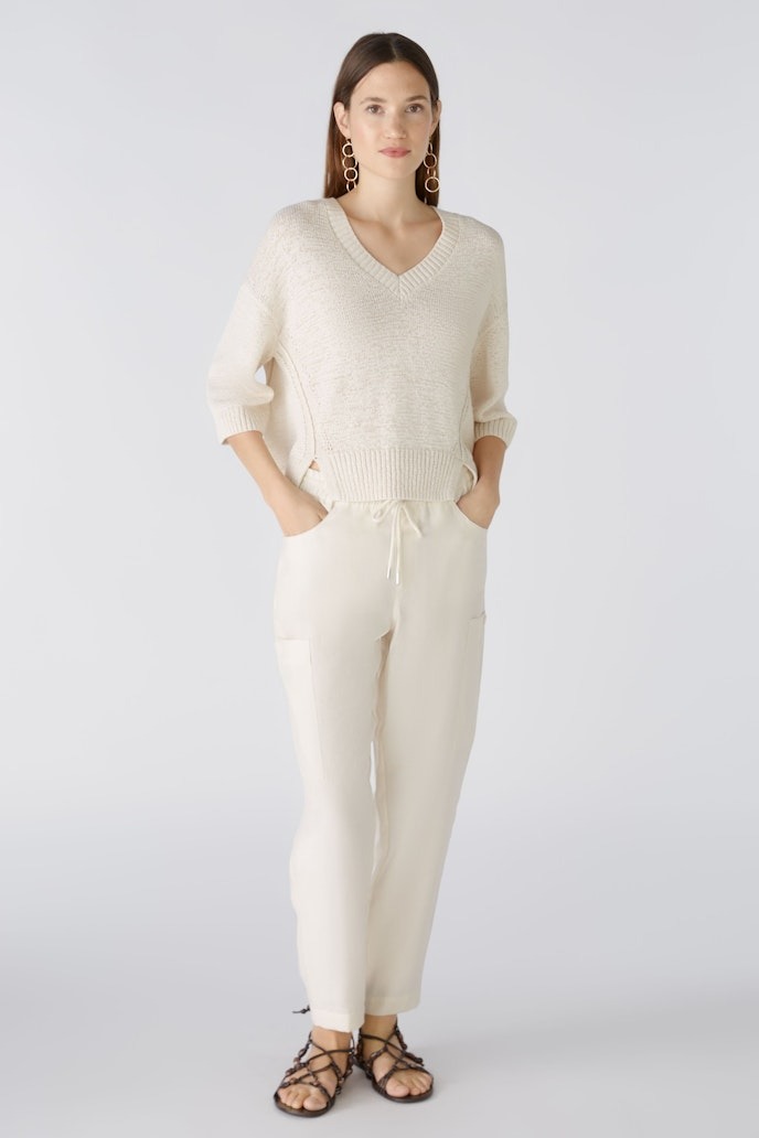 Укороченный свитер из ленточной пряжи с красивыми деталями, такими как убавки и вязаный шов на спине. Ленточная пряжа, гладкая, из смесового хлопка. Повседневный крой, укороченная длина. Глубокий женственный V-образный вырез со спортивной ребристой отделкой. Вырезанное плечо, свободно ниспадает на 3/4 руки. Расширенные боковые швы с разрезами в рубчик, высокий нижний край. Длина для размера 42: 50 см.