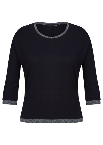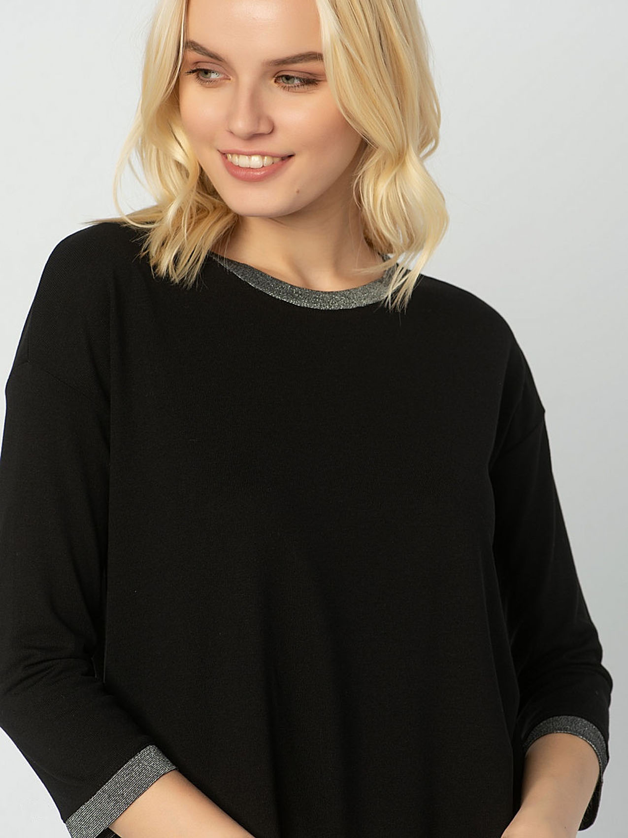 Джемпер прямого покроя. Удлиненная спинка, рукав 3/4 со спущенным плечом, разрезы по бокам. Контрастная отделка с вплетением нити люрекса. Материал из смеси вискозы с полиэстером и эластаном приятен к телу.