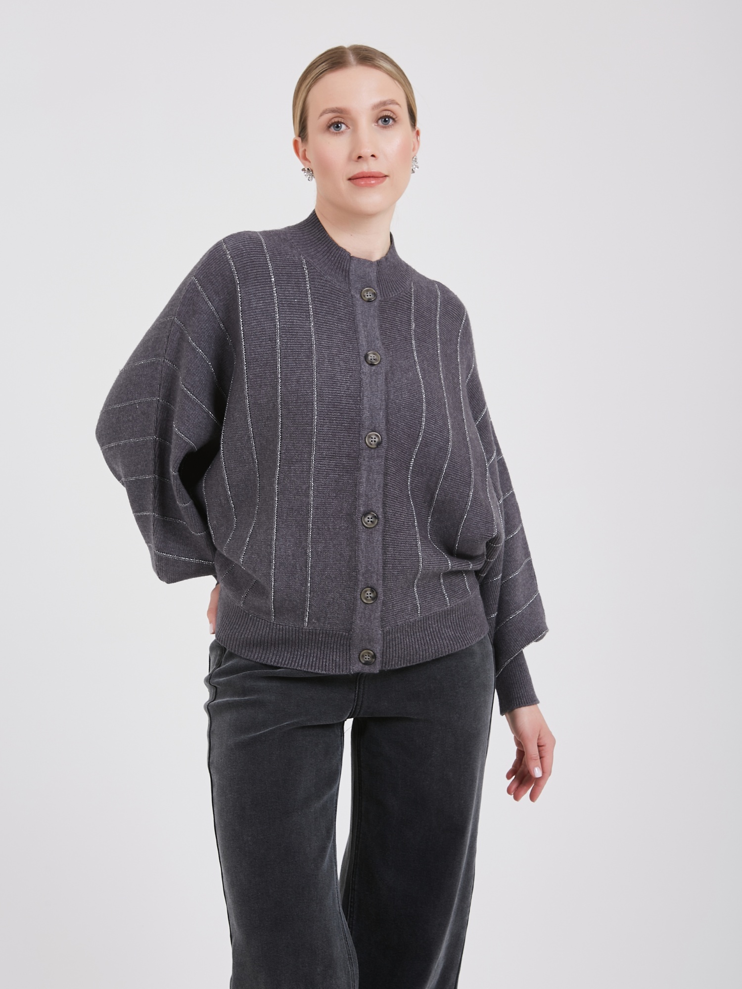 Серый кардиган с объемными рукавами и аккуратными вертикальными полосами придают изделию современный вид. Застежка на пуговицах позволяет регулировать степень открытости горловины, создавая индивидуальный стиль. Универсальность модели делает её отличным выбором для повседневных образов и прохладных вечеров.Осень-Зима'25/26. Капсула "Вишневый сад"
