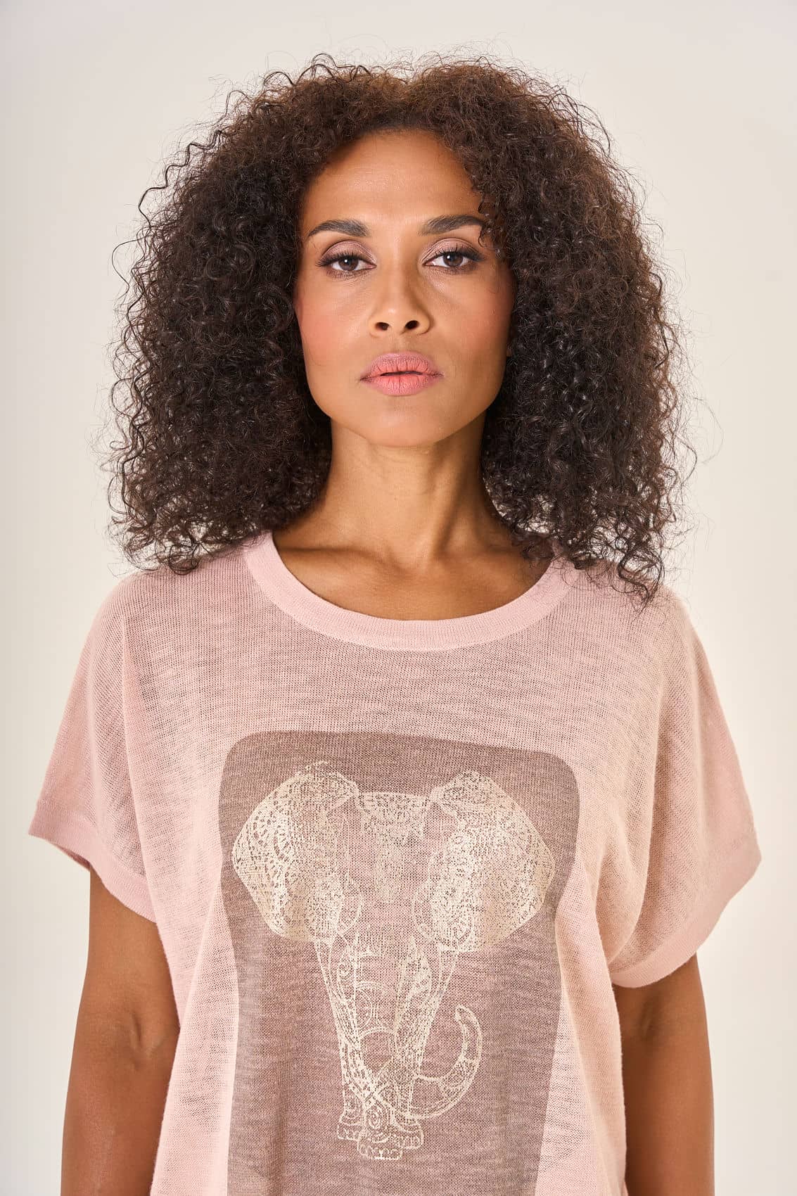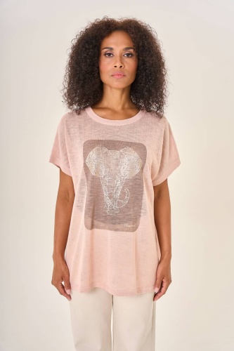 Свободная блузка пастельно-розового оттенка с коротким рукавом и круглым вырезом. Центральное внимание привлекает крупный прямоугольный принт на передней стороне — изящный рисунок слона, выполненный в стилистике классической гравюры. Изящный дизайн и приятный к телу материал делают эту блузку идеальным выбором для создания легкого и романтичного образа.