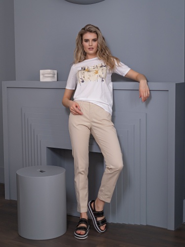 На сайте указаны российские размеры. Ткань: выполнена из 100% гладкого хлопка высокого качества. Крой: слегка приталенная модель, подчеркивающая достоинства фигуры. Имеет круглый вырез и втачной рукав-реглан. Футболка выполнена из гладкого, приятного телу хлопка, который дарит максимальный комфорт – не натирает и не раздражает кожу. Отделка: природный принт украшен золотистым калиброванным бисером, который служит дорогим акцентом всему образу. Сочетается с брюками, джинсами, юбками и шортами из ассортимента Stern.