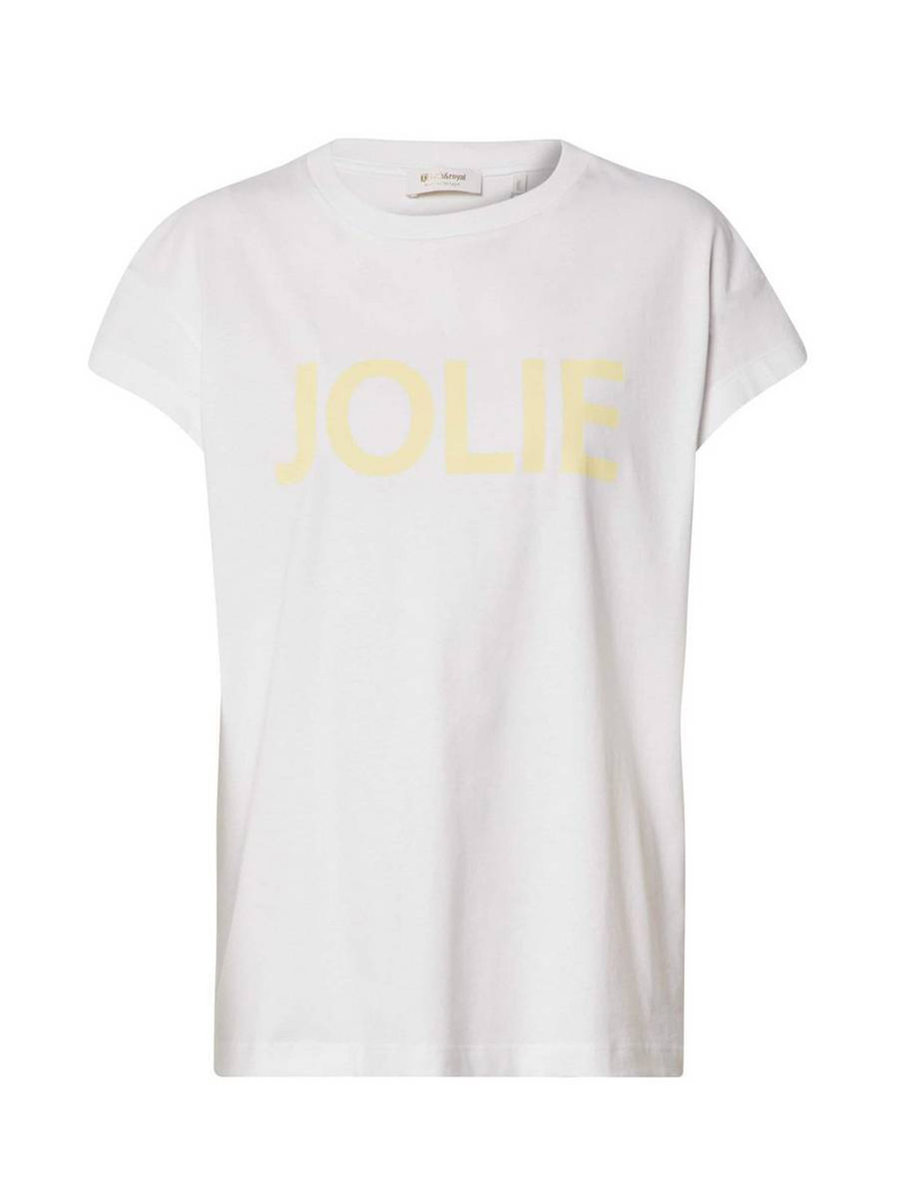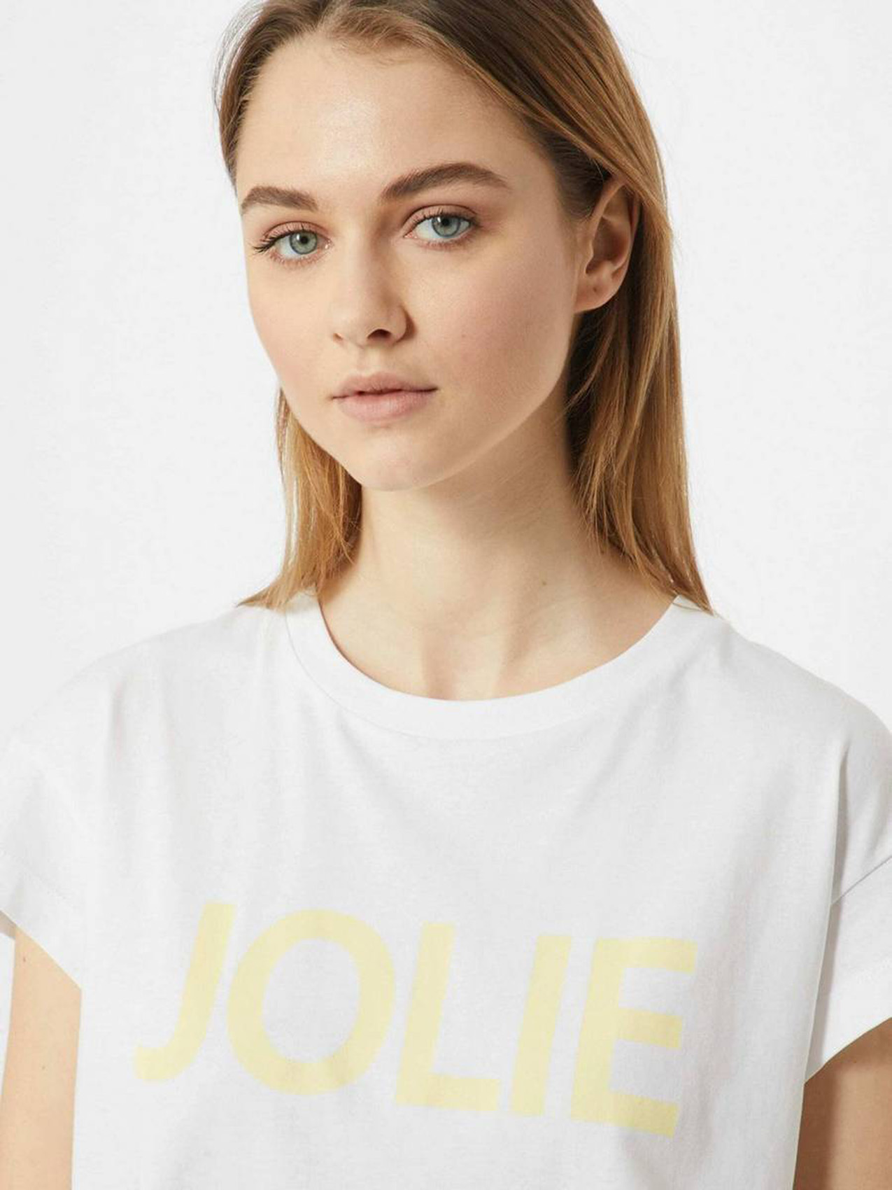 Базовая белая футболка с неоновым акцентом - надписью на груди. Хлопковый материал, прямой покрой и короткий рукав со спущенным плечом обеспечивают комфорт и создают непринужденный образ.