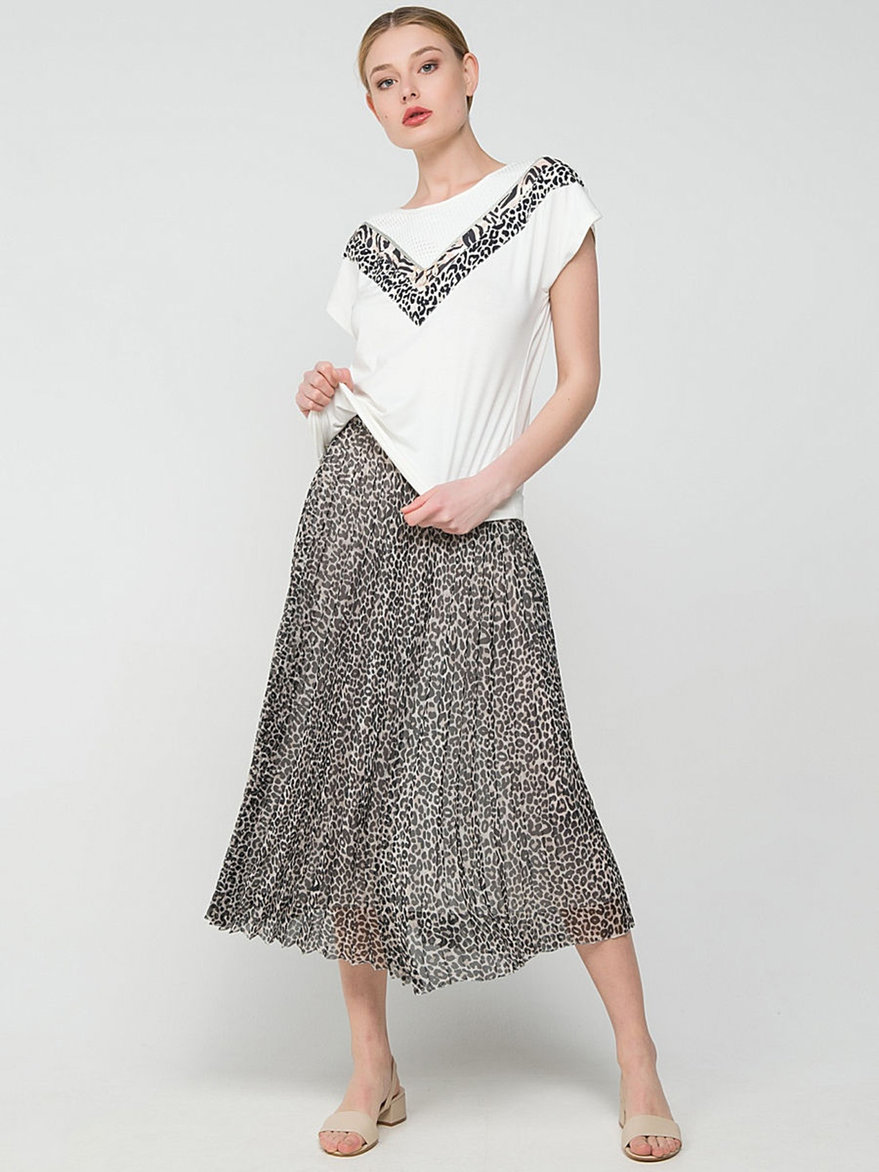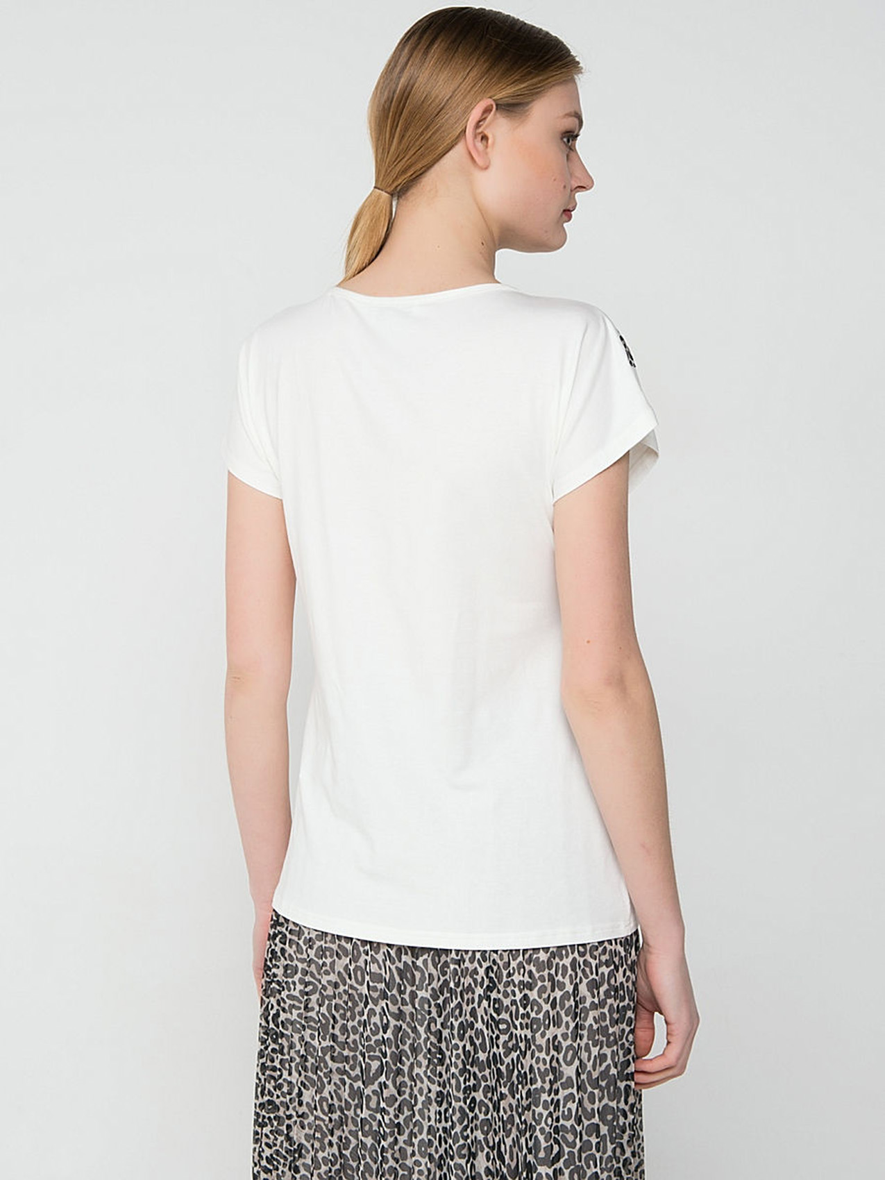 Белая футболка полуприлегающего силуэта совсем не выглядит скучно! А все благодаря декору, который сочетает в себе ракушки, звериный принт и ажурные элементы.