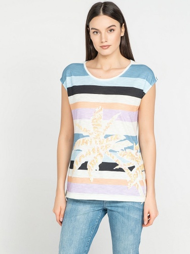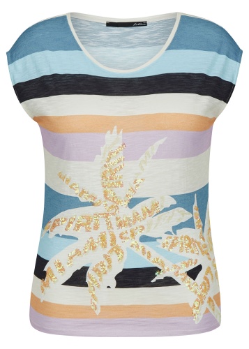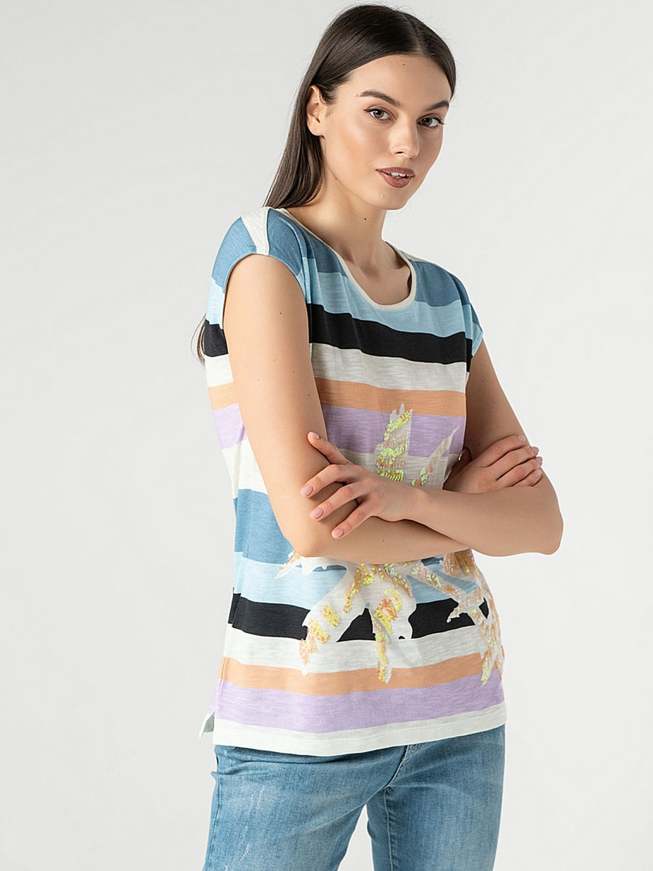 Футболка слегка приталенного силуэта. Круглый вырез, короткие цельнокроеные рукава, небольшие разрезы по бокам. Трендовая полоска. Декор: вышивка пайетками.