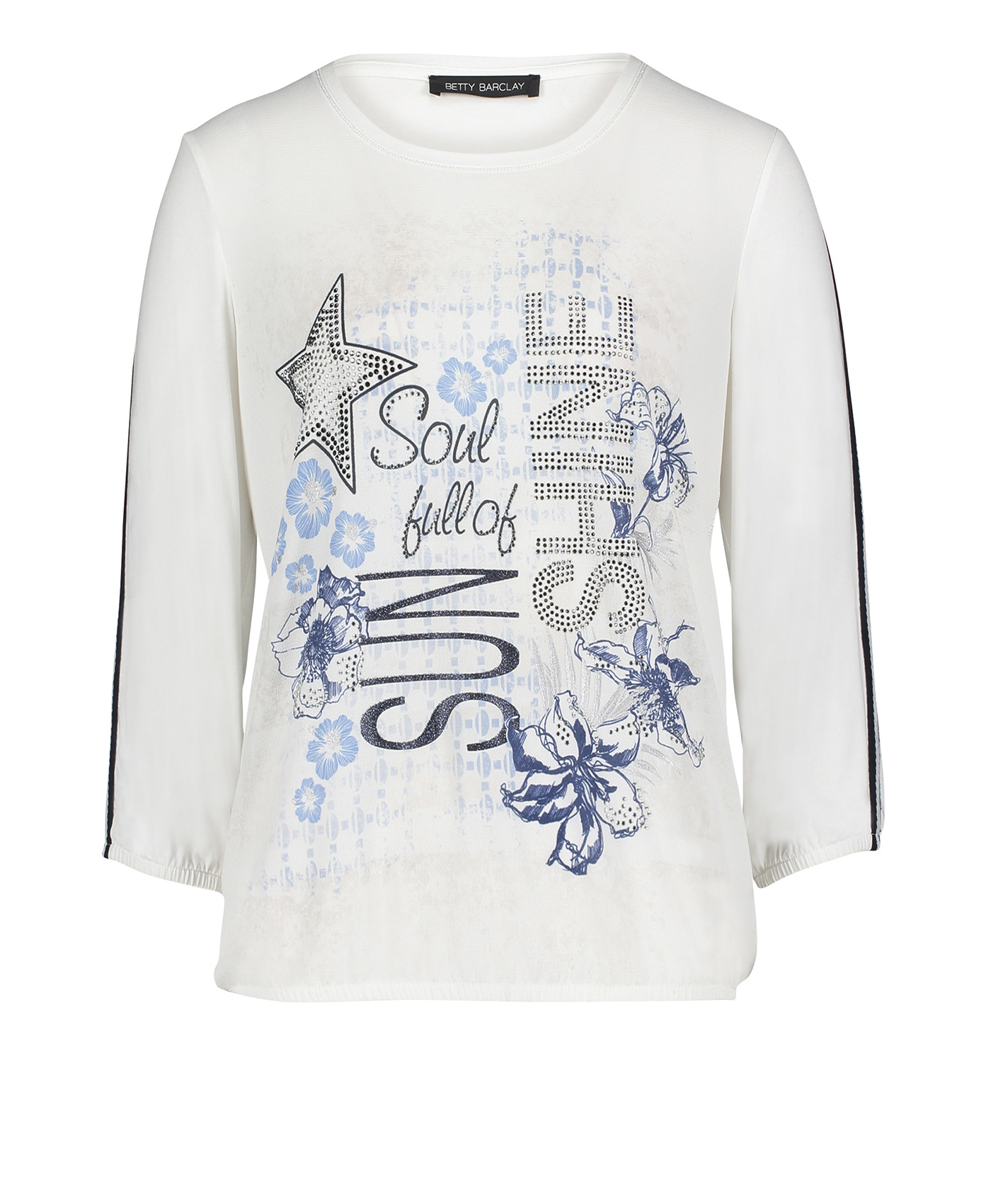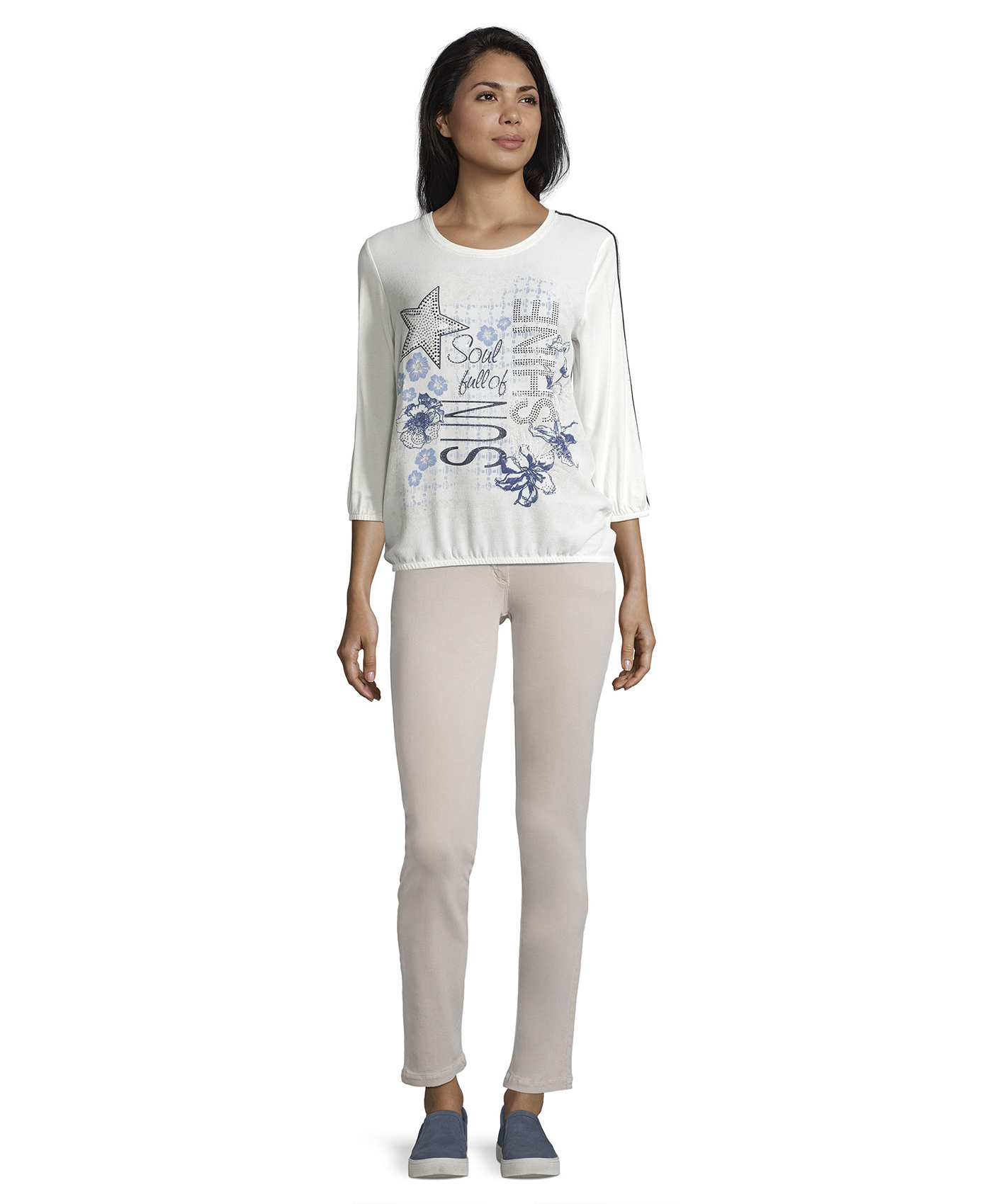 Свобода в тренде! Футболка свободного покроя. Круглый вырез горловины. Рукава 3/4 украшены тесьмой. Декор стразами придает образу нотку гламура. Материал из вискозной смеси приятен к телу и обеспечивает комфорт. Эта футболка станет изюминкой множества образов в стиле кэжуал.