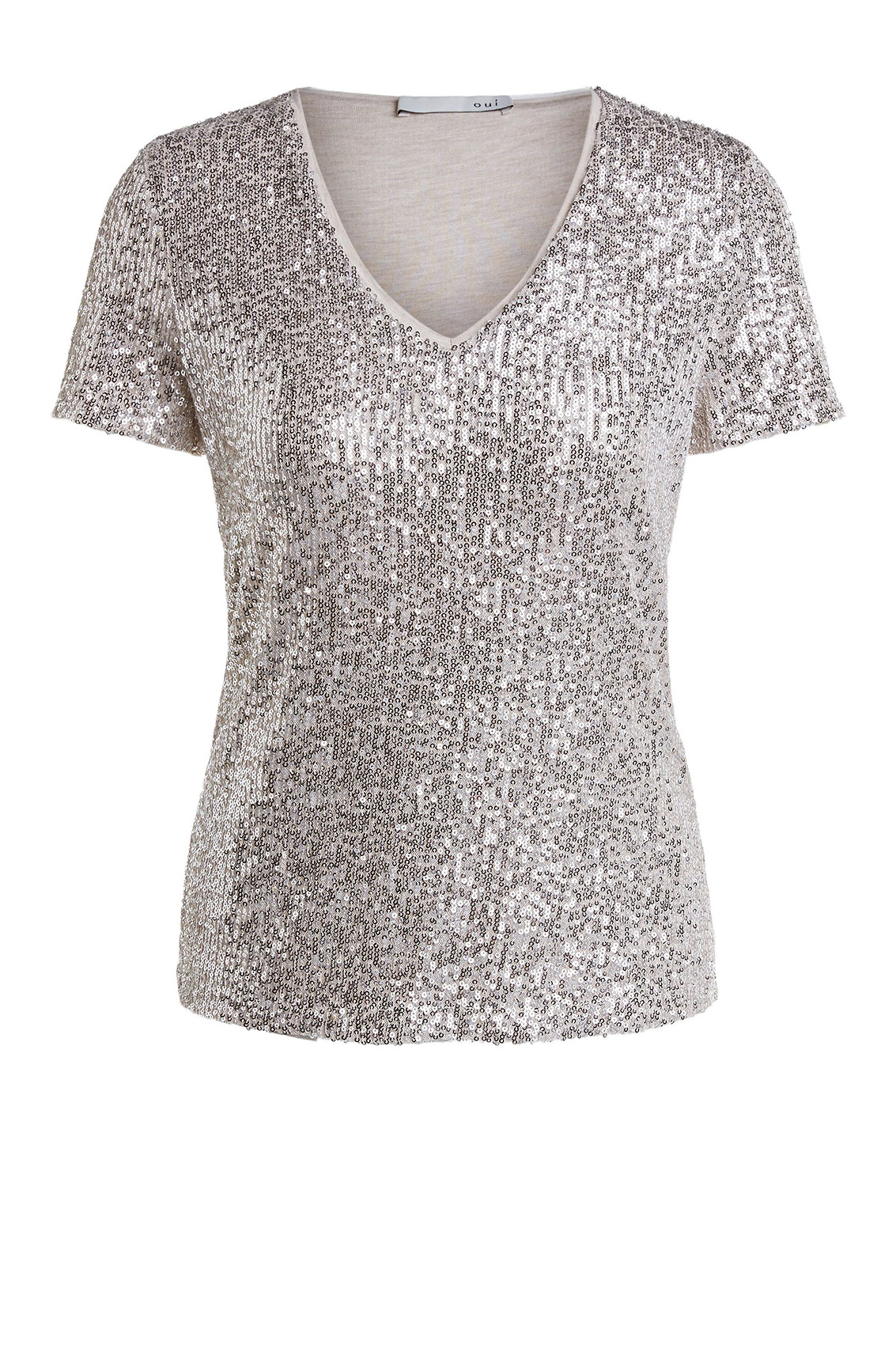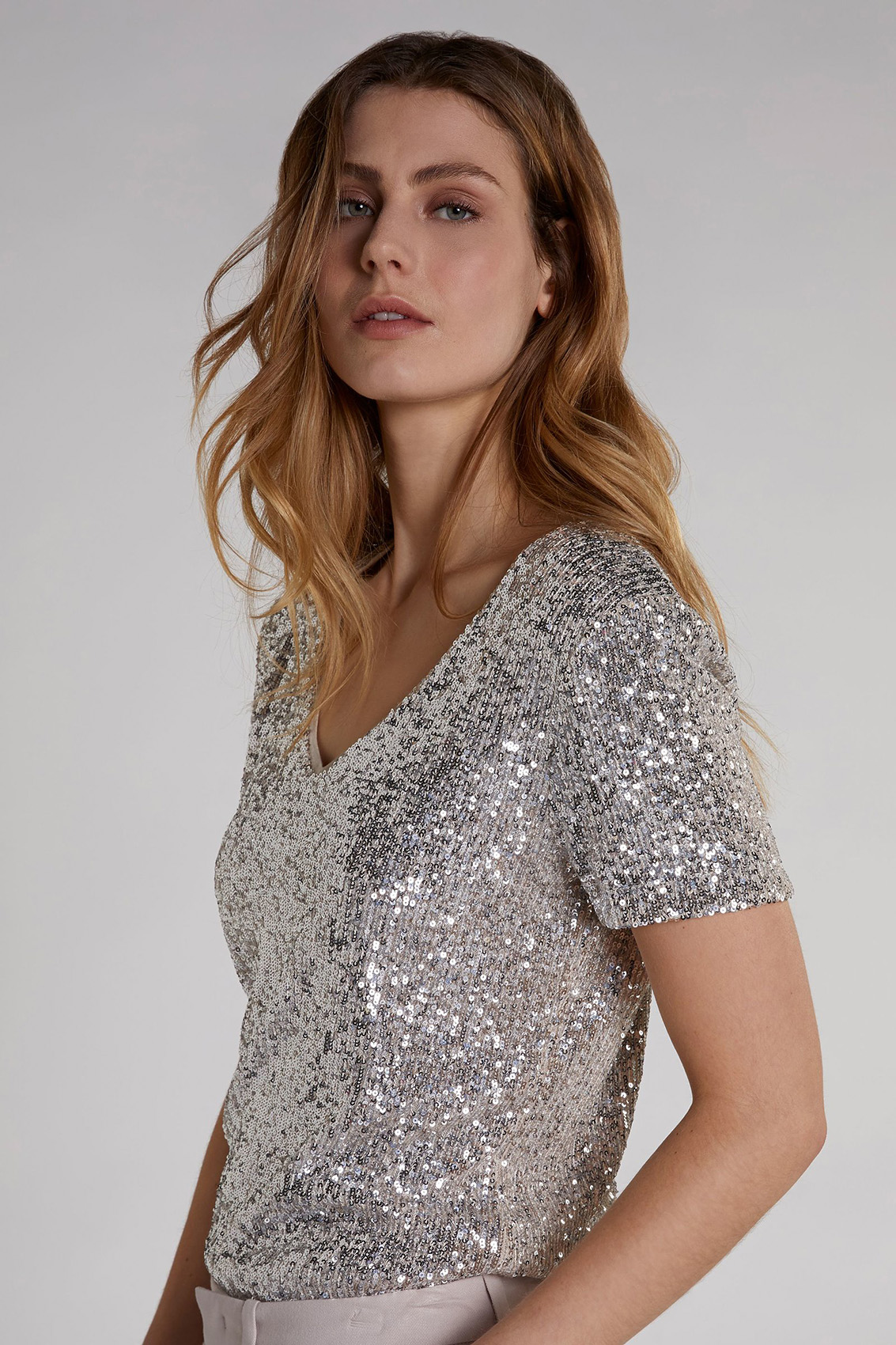Элегантная приталенная футболка подчеркивает достоинства фигуры. V-образный вырез горловины, короткие рукава. Ткань с пайетками придает гламурный блеск. Эта футболка освежает образ, придавая праздничное настроение любому комплекту одежды.