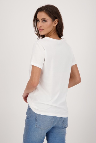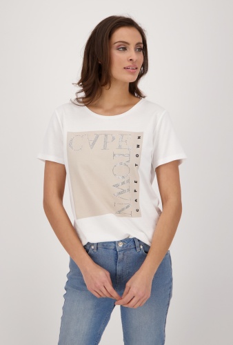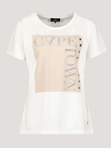 На сайте указаны Российские размеры. Белая футболка с принтом спереди – отличная база для повседневного городского образа. Материал из смесового хлопа обеспечивает комфортную посадку и удобство ношения. Широкий овальный вырез горловины, короткий втачной рукав.