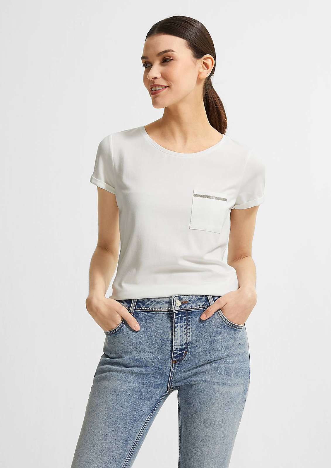 Однотонная белая футболка – базовый элемент любого современного гардероба. Короткий втачной рукав с отворотом, широкий овальный вырез горловины. На груди накладной карман, украшенный декоративной лентой.