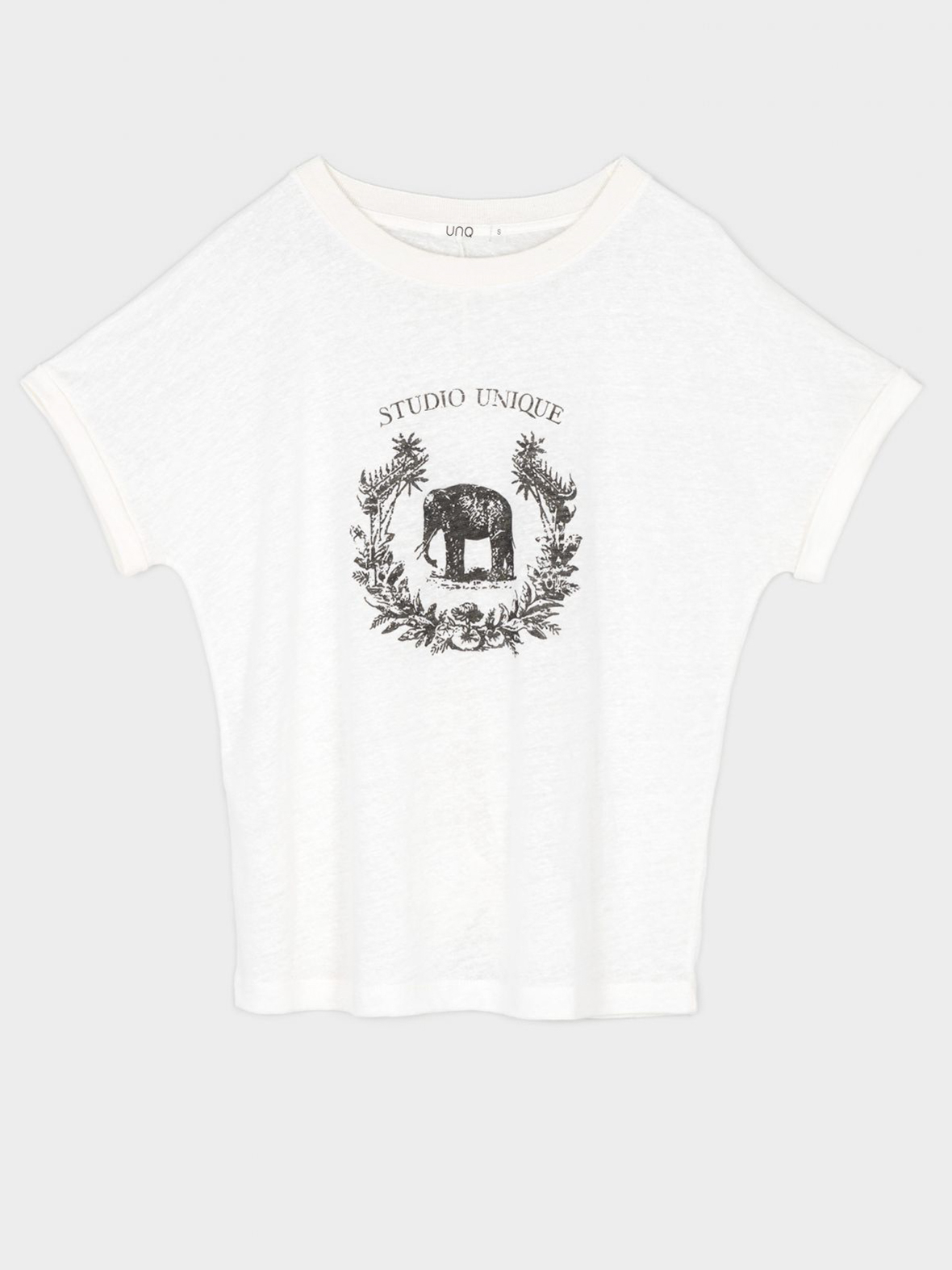 Белая футболка с тропическим принтом спереди. Материал из 100%-го льна приятен к телу и обеспечивает отличную терморегуляцию в жаркое время года. Овальный вырез горловины подчеркивает изящество линии шеи. Короткий втачной рукав с отворотами добавляет свободы и легкости образу.