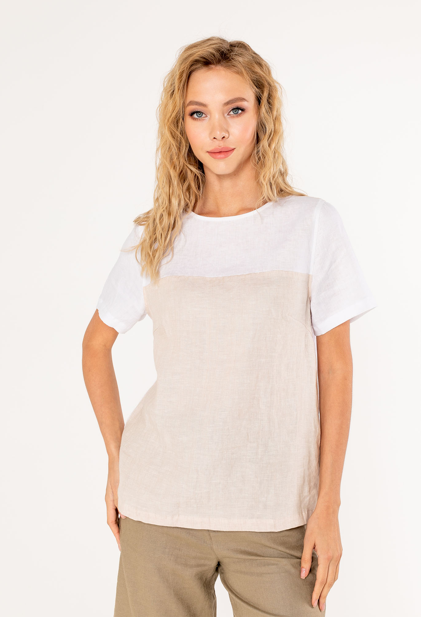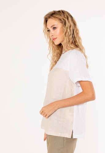 На сайте указаны российские размеры. Ткань: Легкая блузка из 100% льна. Лен – идеальный природный материал, который выбирают за приятные ощущения на теле, воздухопроницаемость и дорогую стильную фактуру. Крой: Свободная блузка с коротким рукавом – идеальная базовая модель, которая не сковывает движение и дарит максимальный комфорт. Круглый вырез добавляет элементов casual и спорт-шик, позволяя создавать сотни образов для повседневной жизни. Универсальность модели одинаково выигрышно смотрится на разных типах фигур, широкая линейка до 56 размера позволяет удовлетворить спрос женщин разной комплекции. Отделка: непревзойденный стиль блузки создает союз из двух сдержанных, но стильных оттенков, которые подчеркнут красоту женщин разных цветотипов. Комбинация цветных блоков или Color Block – нескучная классика, не выходящая из моды, но приковывающая сотни взглядов к удивительному контрасту на одежде.