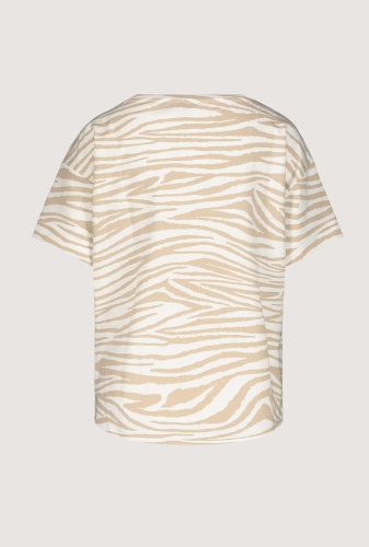 На сайте указаны российские размеры. Легкая футболка с короткими рукавами в анималистическом стиле. Модель с половиной рукавов имеет прямой фасон, круглый вырез горловины, края рукавов с притачными манжетами и необработанными краями, а также удлиненную спинку с закругленным краем. Великолепный рисунок зебры по всей поверхности оживляет дизайн. Параметры модели: 42 размер, рост 181 см