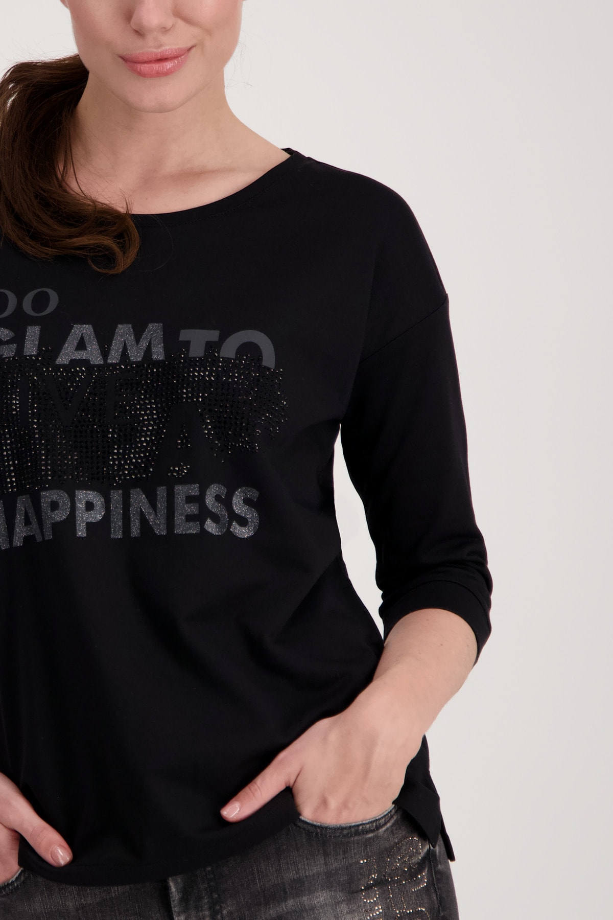 На сайте указаны российские размеры. Футболка из джерси с рукавами 3/4 и стразами. Форма: прямой крой с манжетами на концах рукавов и вставкой на круглом вырезе горловины. Высококачественная смесь хлопка и модала обеспечит комфорт в течение всего дня. Вы не должны обходиться без этого. Модель ростом 179 см.