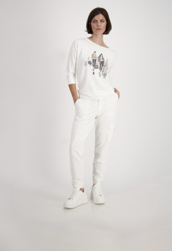 На сайте указаны российские размеры. Футболка из джерси с принтом и рукавами ¾ кремового цвета. Передняя часть этой рубашки из джерси монари украшена модным принтом с изображением двух женщин на фоне города и тигра. Работа украшена сверкающими деталями из страз. Фасон: прямого кроя со вставкой на круглом вырезе горловины, широкими манжетами на концах рукавов ¾ и объемными плечами. Изделие выглядит гламурно благодаря оверлочным швам с люрексом вдоль рукавов. Идеально подходит для хорошего самочувствия благодаря обработке струящейся вискозы, смешанной с модалом и стрейч. Модель ростом 176 см. Длина спины 44 размера составляет 62 см.