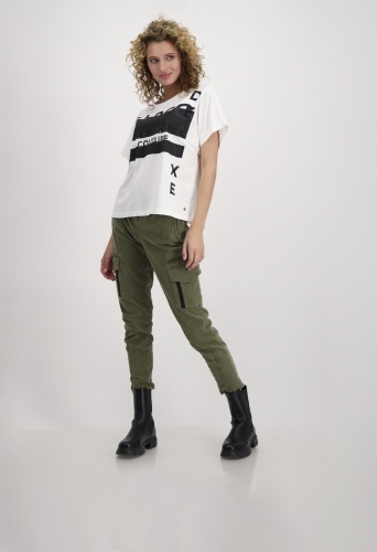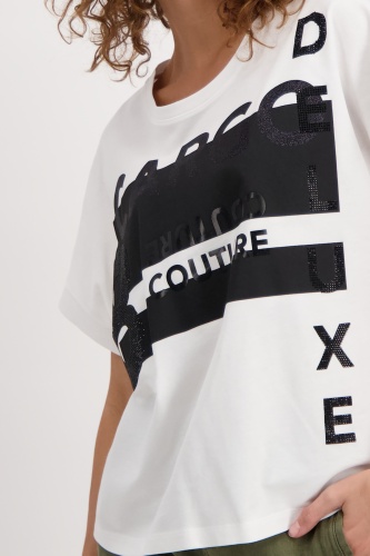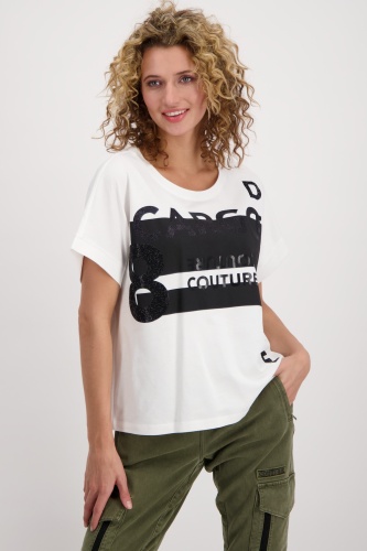 На сайте указаны российские размеры. Футболка из джерси с половиной рукавов, круглым вырезом и принтом. Сочетание контрастных букв из сверкающих стразов, блесток и глянцевого лакированного принта в сочетании с двумя контрастными цветными принтами спереди делает рубашку из джерси monari вашим новым любимым компаньоном. Форма: прямой крой со вставкой и оверлочным швом в тон по круглому вырезу горловины и предполагаемому, накладывающемуся короткому рукаву с манжетами на концах рукавов. Сочетание высококачественного хлопка и модала также гарантирует комфорт в течение всего дня. Модель ростом 176 см. Длина спины 44 размера составляет 62 см.