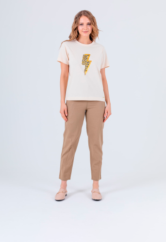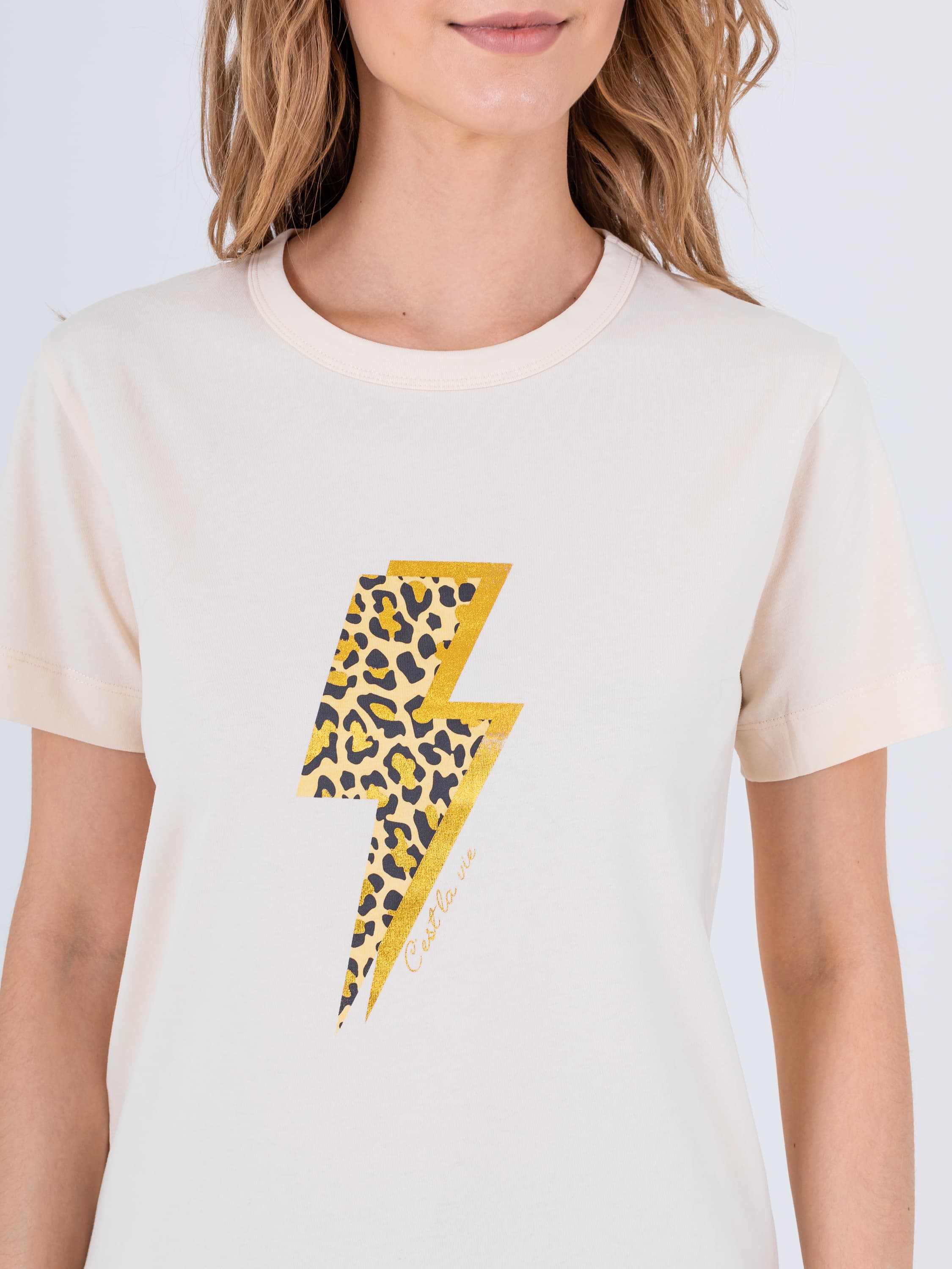 На сайте указаны российские размеры. Футболка средней длины прямого силуэта из легкого 100% хлопка. По переду выполнен яркий леопардовый принт. Укороченные втачные рукава. Круглый вырез горловины.