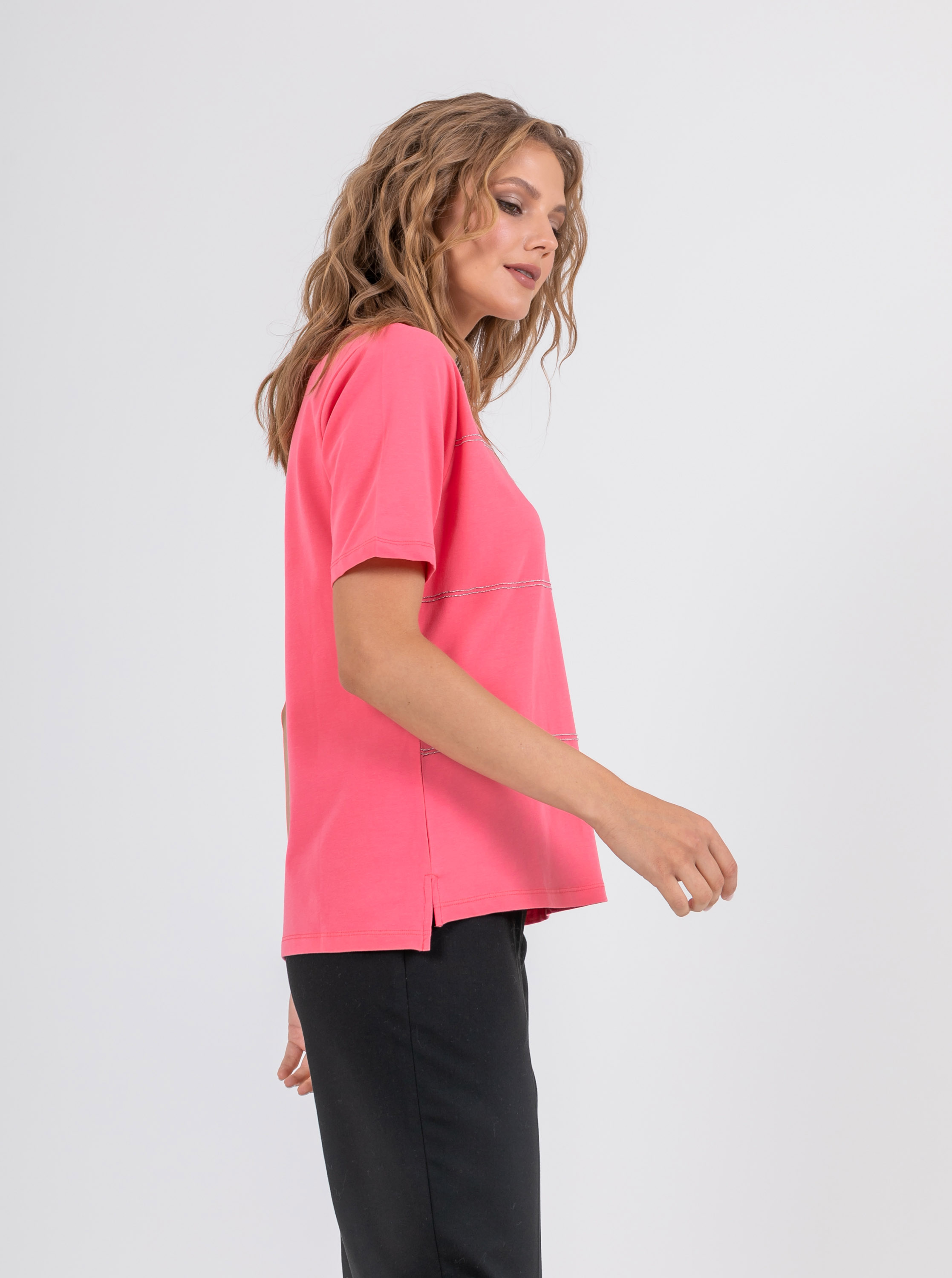 На сайте указаны российские размеры. Мягкая футболка из 100% хлопка. Свободный крой, круглый вырез горловины, рукава 1/3, слегка удлиненная спинка, по бокам небольшие разрезы. Перед модели акцентирован полосками из декоративных блестящих страз.