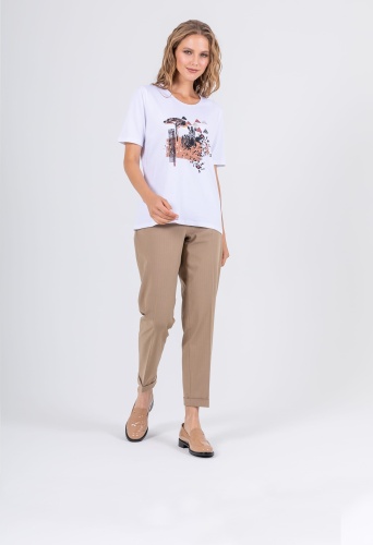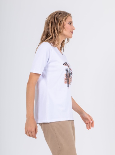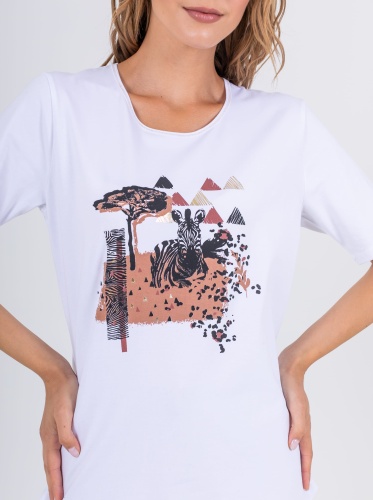 На сайте указаны российские размеры. Ткань: выполнена из гладкого хлопка высокого качества (95%) и эластана, добавляющего ткани упругости (5%) Крой: базовая модель освежающего белого цвета прямого силуэта. Имеет круглый вырез и втачной рукав-реглан. Футболка выполнена из гладкого, приятного телу хлопка, который дарит максимальный комфорт – не натирает и не раздражает кожу. Отделка: украшена оригинальным принтом с очаровательной зеброй на фоне саванны. Нанесение выдерживает множество циклов стирки, не выцветает и не трескается.