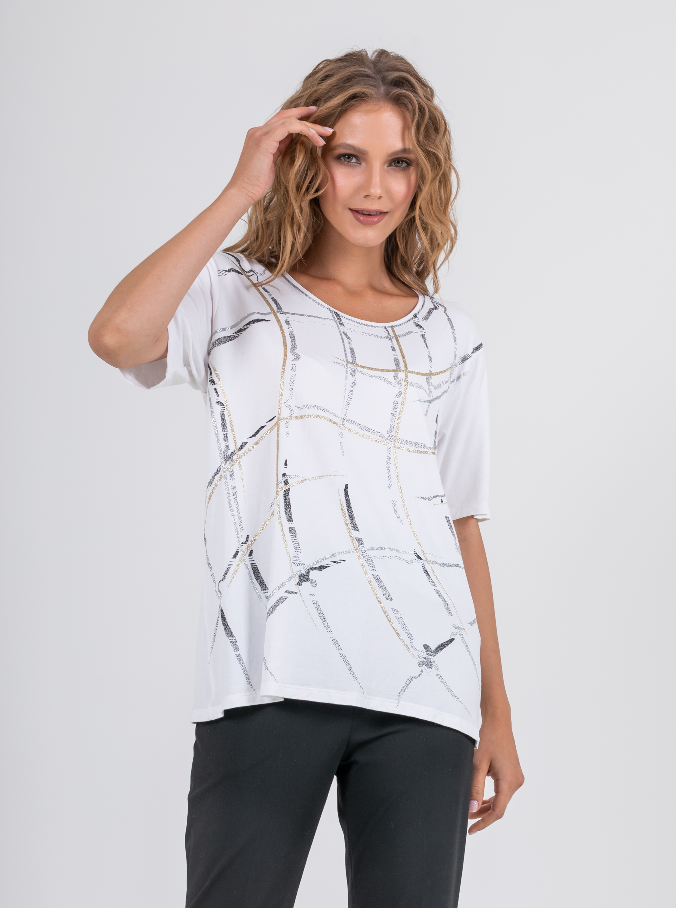 Футболка средней длины прямого силуэта из легкой, мягкой вискозы с добавлением эластана. По переду выполнен нежный принт. Укороченные втачные рукава. Круглый вырез горловины с отделочной строчкой по переду.