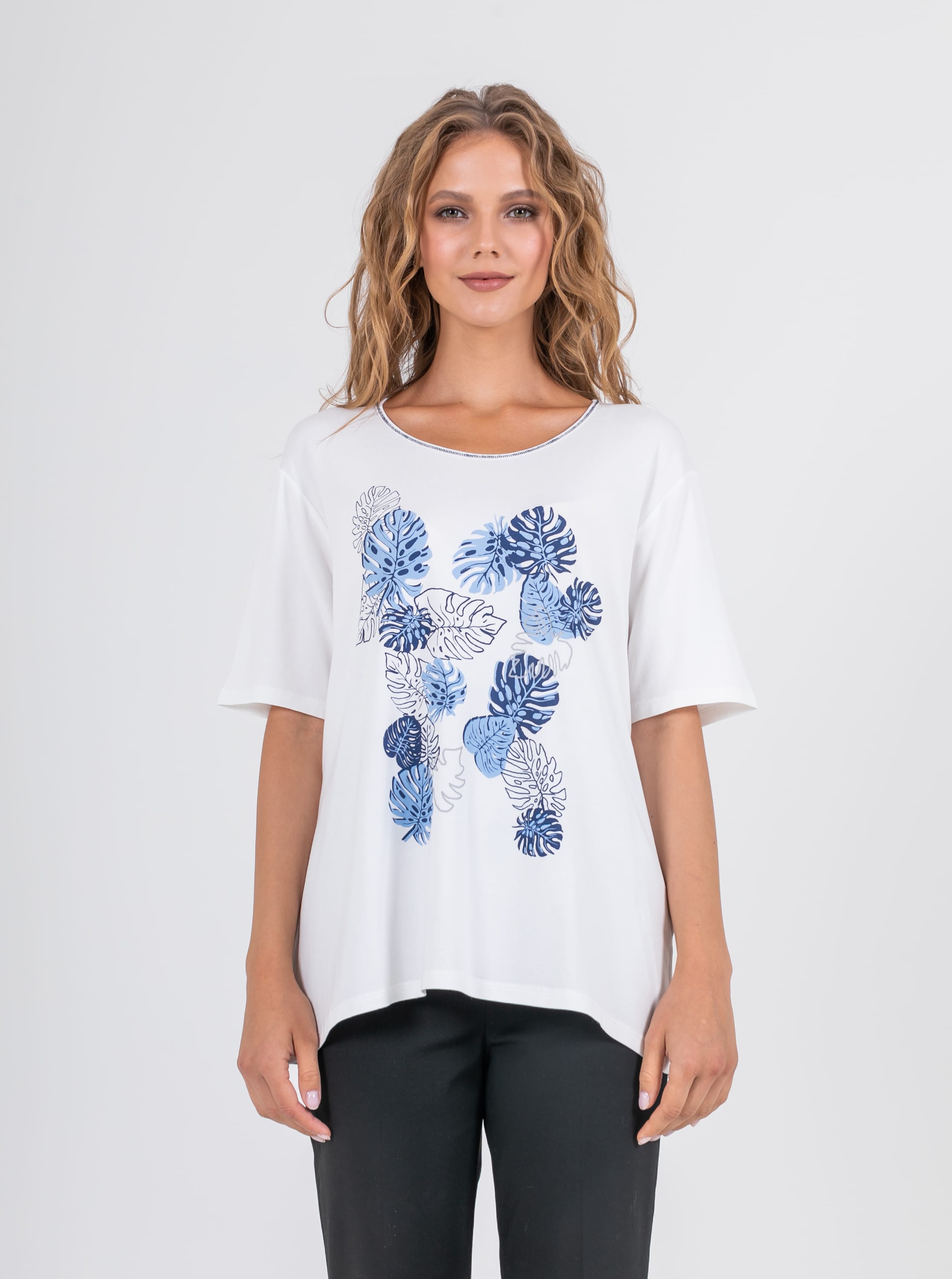 На сайте указаны российские размеры. Ткань: изготовлена из высококачественной вискозы (92%) – экологичного материала, хорошо пропускающего воздух и впитывающего излишки влаги, и эластана (8%), придающего ткани упругость. Крой: футболка удлиненная прямого силуэта с коротким свободным рукавом-регланом. Классическая модель с круглым вырезом – база, которая прекрасно смотрится на женщинах разного роста и комплекций. Обеспечивает максимальный комфорт, прекрасно садится по фигуре. Отделка: футболку украшает стильный принт с актуальными уже несколько сезонов монстерами. Вырез обрамляет контрастная синяя строчка-зигзаг, добавляющая образу оригинальности.