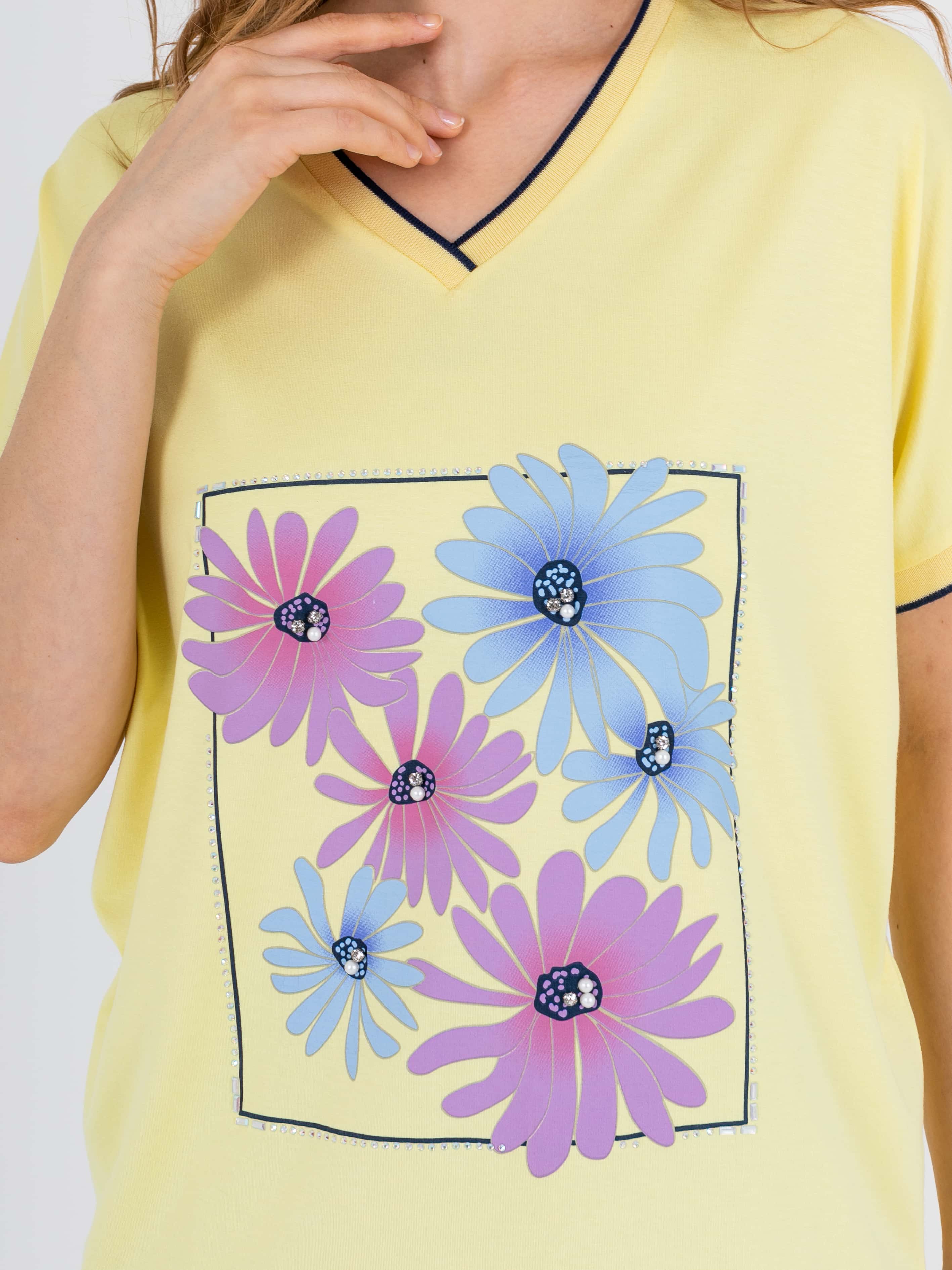 На сайте указаны российские размеры. Оверсайз футболка средней длины прямого силуэта из легкой, мягкой вискозы с добавлением эластана. По переду выполнен яркий принт и аппликация со стразами. Укороченные цельнокроеные рукава с манжетами и контрастным кантом. V-образный вырез горловины, обработанный трикотажной косой бейкой с контрастным кантом.