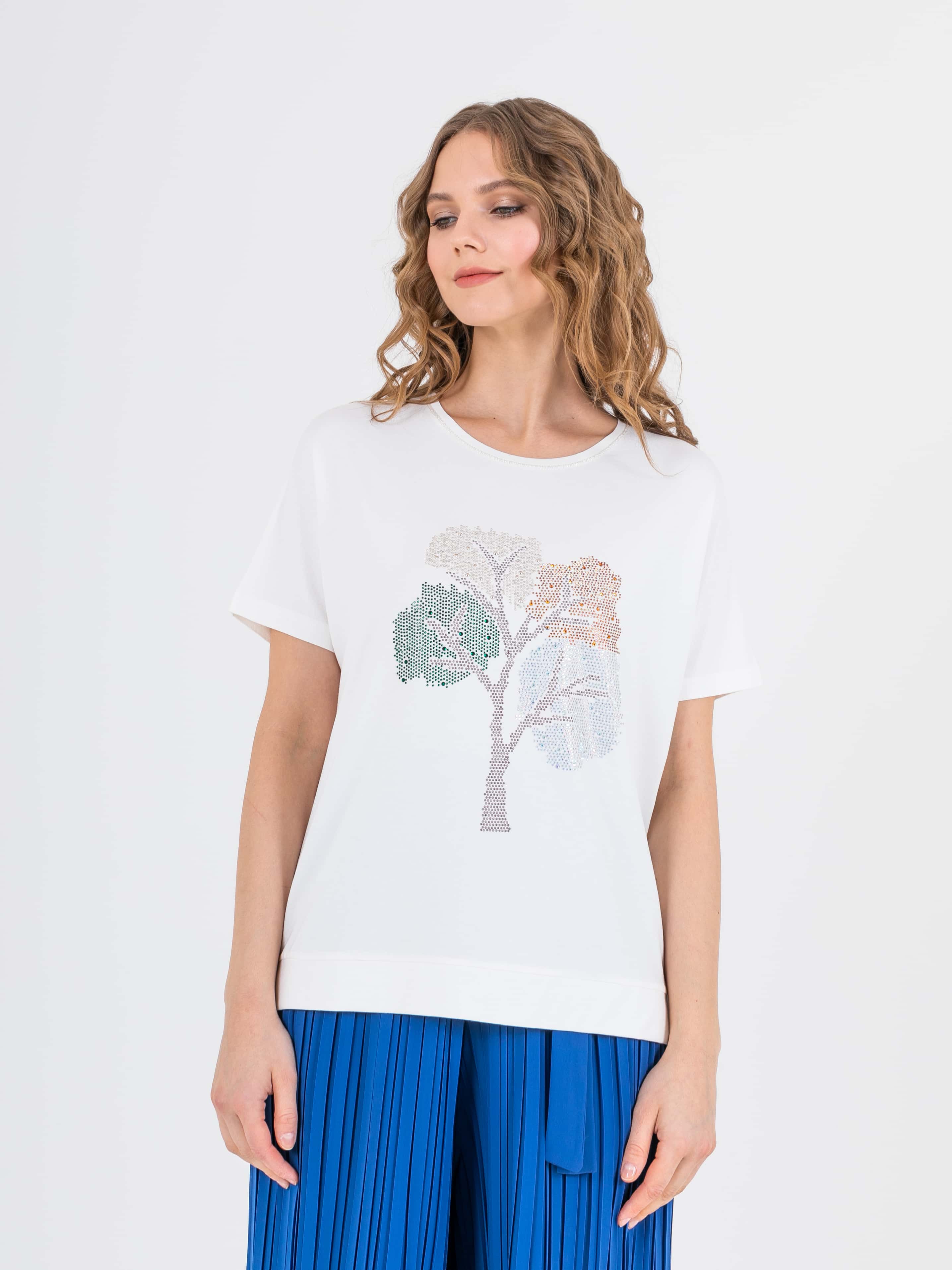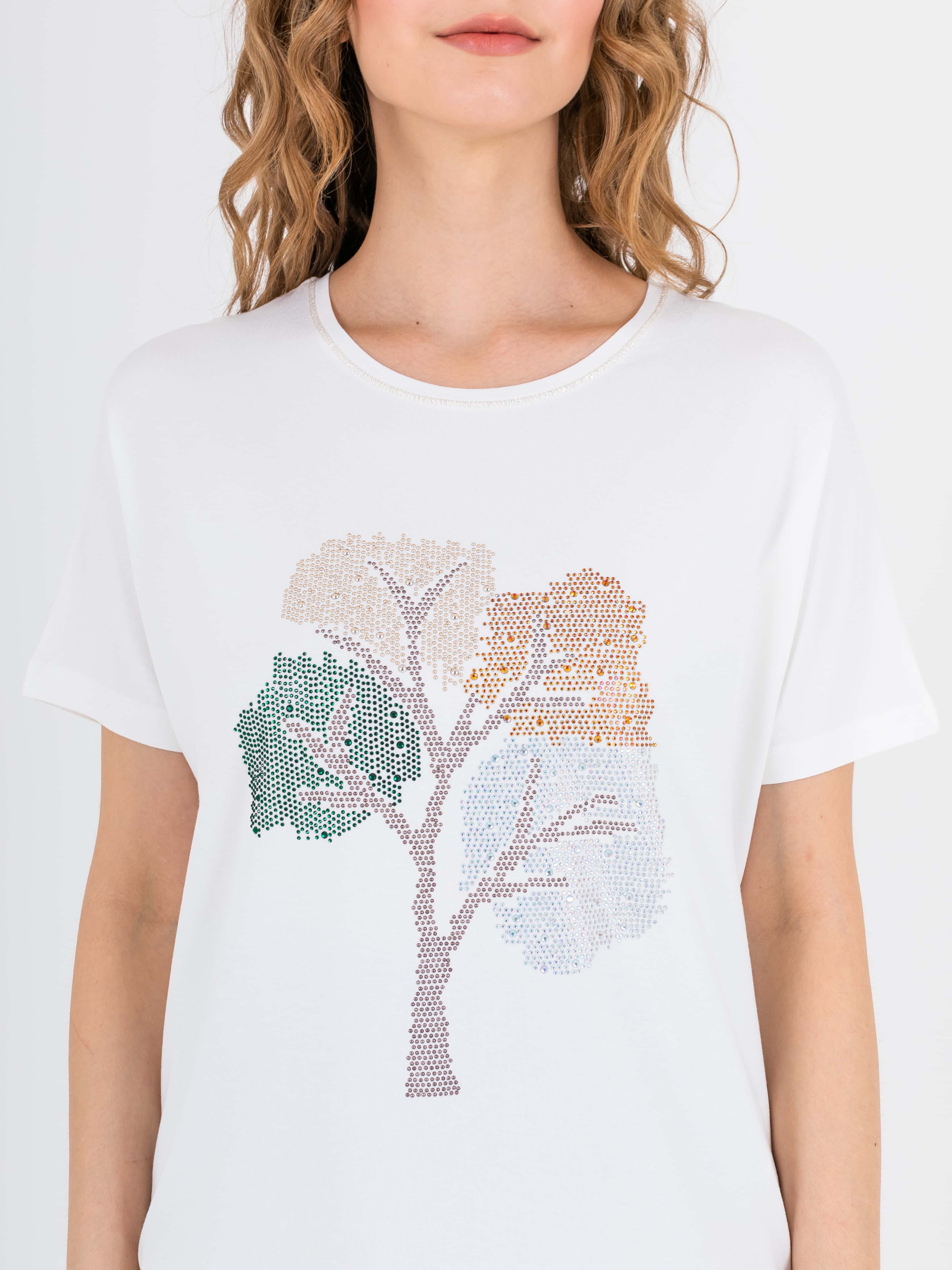 На сайте указаны российские размеры. Футболка средней длины прямого силуэта из легкой, мягкой вискозы с добавлением эластана. Перед и спинка по низу обработаны манжетой с разрезами в боковых швах. По переду выполнена эффектная аппликация со стразами Укороченные цельнокроеные рукава. Круглый вырез горловины с отделочной строчкой.
