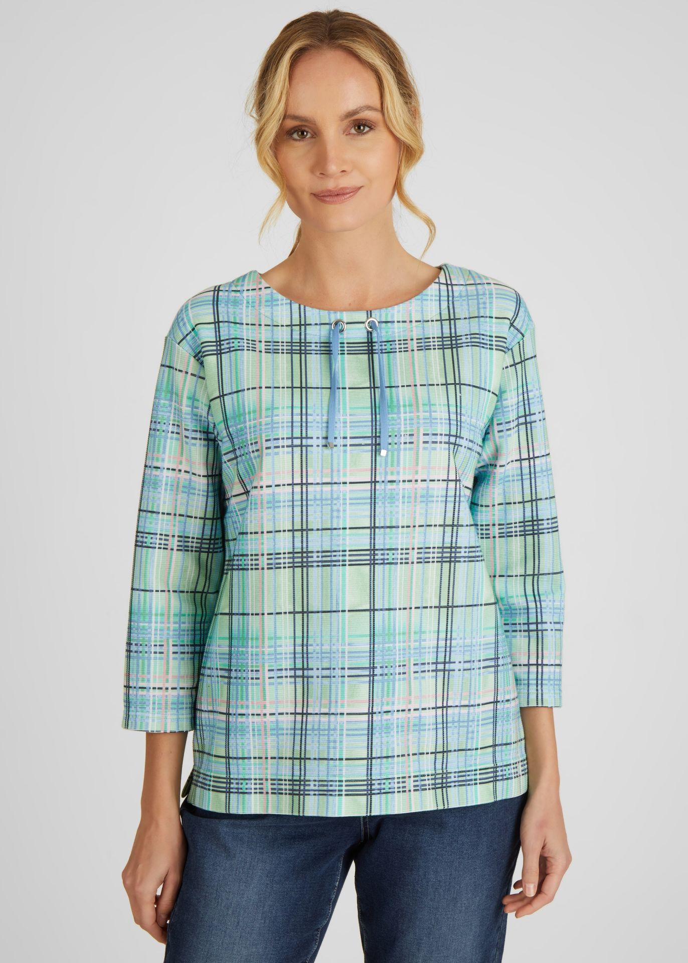 На сайте указаны российские размеры. Футболка в клетку с небольшим воротником-стойкой — must have в вашем гардеробе. Рукава 3/4 и прямой крой гарантируют удобную посадку. На сдержанном воротнике-стойке небрежная кордовая тесьма. Эту толстовку легко комбинировать с любимыми брюками. Длина по спинке от плеча для размера 46: 64 см. Рост модели 176 см.