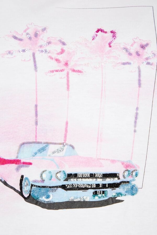На сайте указаны Российские размеры. Классическая футболка с коротким рукавом и ипринтом с машиной и пальмами. Принт расшит различными бисером и пайетками.