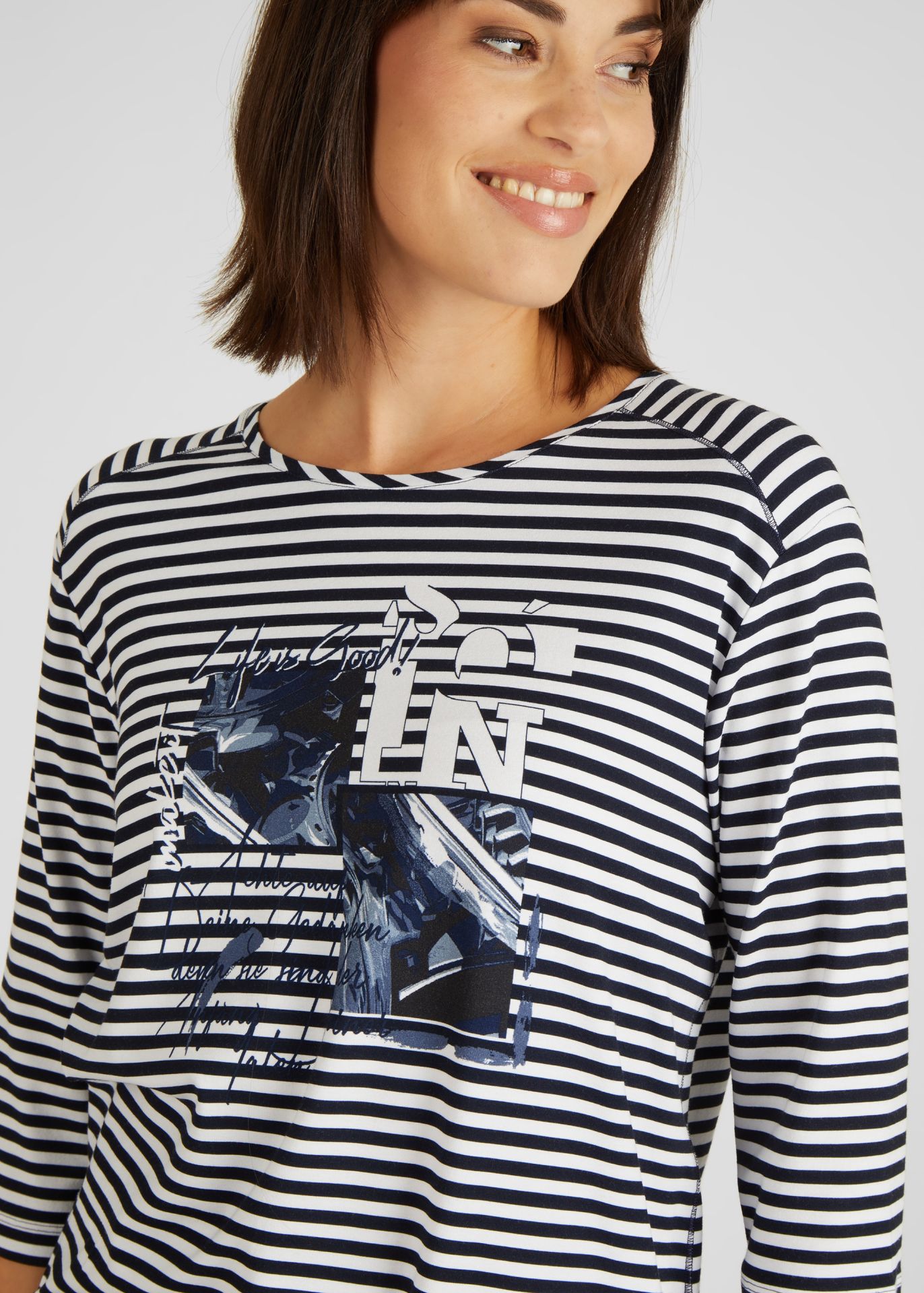 На сайте указаны российские размеры. Футболка с рукавами 3/4 из эластичного трикотажа качества вискозы – это абсолютный талант сочетания. Рубашка в полоску с абстрактным узором и надписью спереди привлекает внимание. Круглый вырез и резинка по низу обеспечивают идеальную посадку. Сочетайте рубашку с кроссовками и любимыми брюками. Длина по спинке от плеча для размера 46: 64 см. Рост модели 176 см.