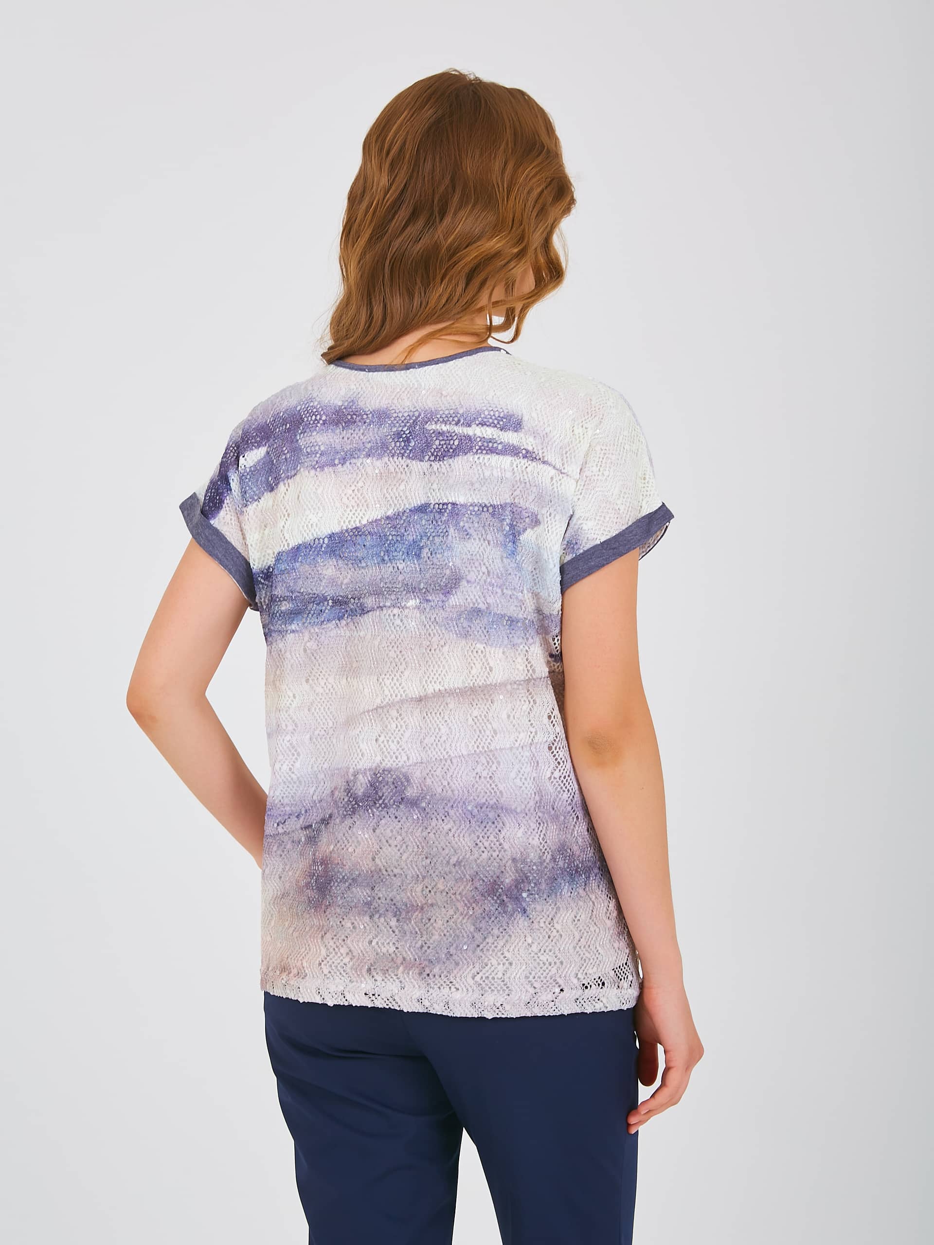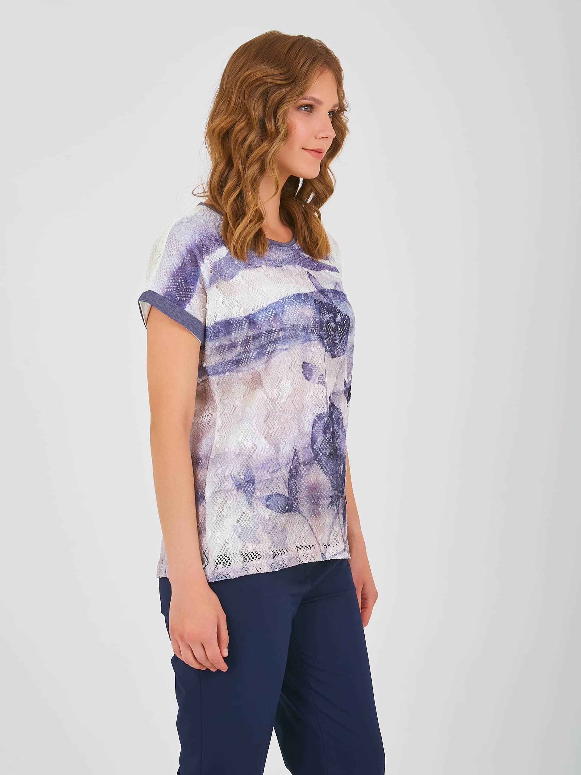 Двухслойная футболка средней длины прямого силуэта из полиэстера с добавлением мягкой вискозы, дизайнерская особенность модели – растительный принт и ажурный трикотаж. Короткие цельнокроеные рукава с манжетами. Круглый вырез горловины.