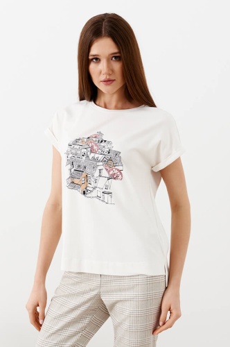 Футболка прямого силуэта, выполнена из трикотажного полотна. Овальный вырез горловины. Слегка спущенная линия плеча с небольшими цельнокроеными рукавами. Удлиненная спинка, боковые швы заканчиваются разрезами. Спереди выполнен дизайнерский принт «Городские мотивы», декорированный пайетками и стразами.