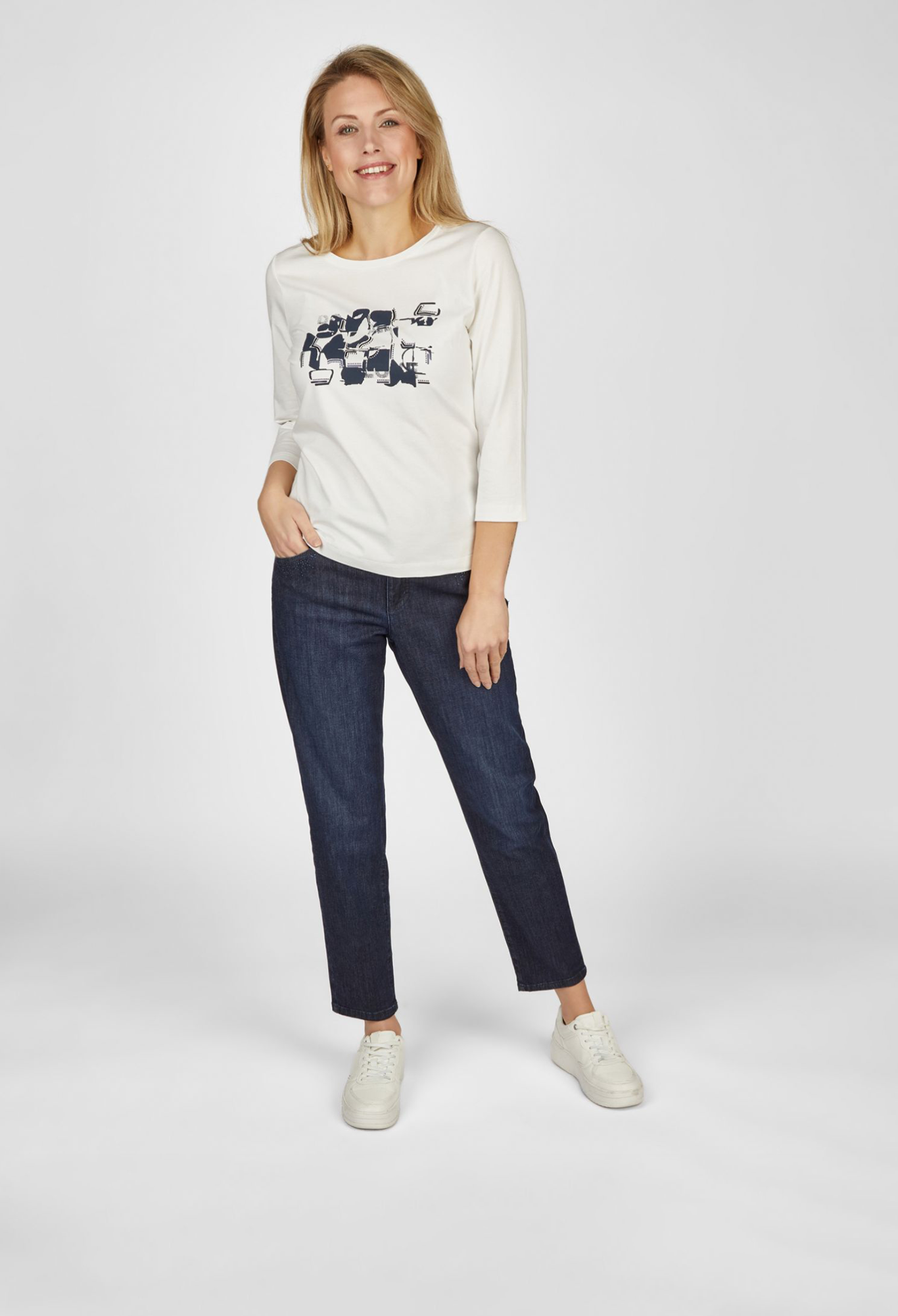 Универсальная однотонная футболка с рукавами 3/4 и принтом спереди, украшенная сверкающими камнями. Футболка изготовлена из высококачественной смеси хлопка и эластана и подойдет для любого случая. Простой дизайн позволяет легко комбинировать и придает вашему наряду особый шарм.