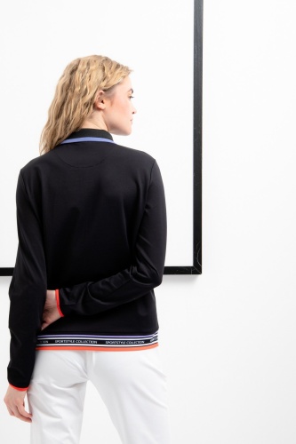 Повседневная рубашку-поло с длинными рукавами. Классический вязаный воротник имеет контрастную полоску по краю и заканчивается короткой молнией, гарантирующей комфортное одевание. Передняя часть с эксклюзивным графическим принтом со встроенными логотипами Sportalm привлекает всеобщее внимание. Рукава отделаны эластичной резинкой, а по низу имеется полосатая вышивка на манжете с надписью Sportalm. Классическую этикетку сзади заменяет принт из фольги.